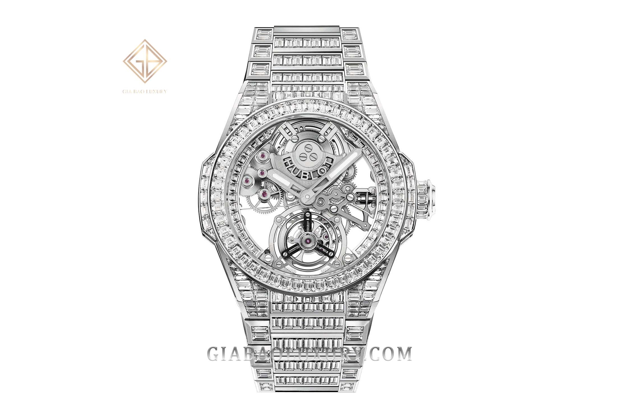 Nếu cảm thấy sapphire với mặt cắt lớn trên chiếc Big Bang Integral Tourbillon Full Sapphire có hơi phần khoa trương, đồng hồ Big Bang Integral Tourbillon High Jewellery có thể sẽ khiến khách hàng ưng ý với những viên kim cương baguette. Chiếc đồng hồ hiện tại được làm từ vàng trắng kết hợp cùng 484 viên kim cương (trọng lượng 31 carat) đem đến vẻ ngoài lộng lẫy và lấp lánh.