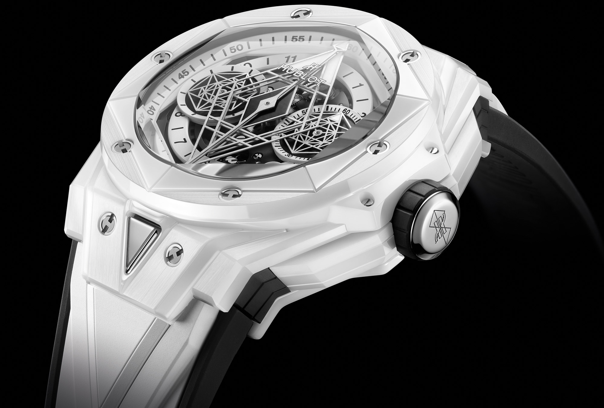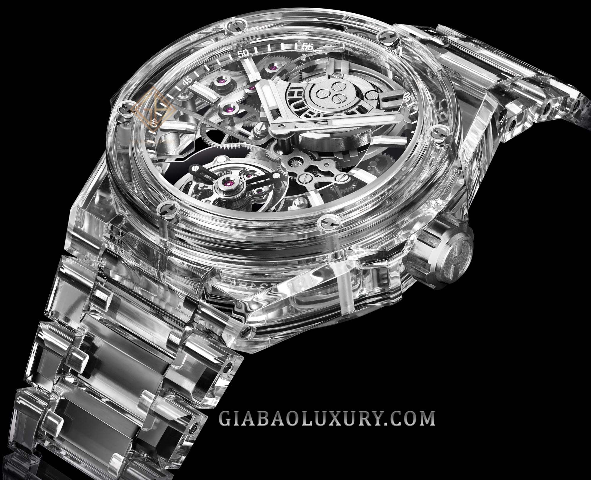 Sau 5 năm tập trung vào việc sử dụng vật liệu tiên tiến, cuối cùng Hublot đã tạo ra một chiếc Big Bang 43mm làm từ sapphire toàn bộ, từ vỏ đồng hồ cho tới phần dây dây đeo tích hợp. Trên chiếc đồng hồ mới, Hublot đặt ra mục tiêu: loại bỏ tối đa các ốc vít có thể nhìn thấy (tránh cản trở “tính trong suốt" của sapphire), điều chỉnh lại dáng vỏ của chiếc Big Bang cơ bản để thật phù hợp với dây đeo tích hợp trong chất liệu sapphire đồng thời xử lý lại tấm khung và cầu nối trên bộ máy đồng hồ để tạo ảo giác như chúng thực sự đang lơ lửng - đánh mạnh vào hiệu ứng thị giác mà đồng hồ đem lại.