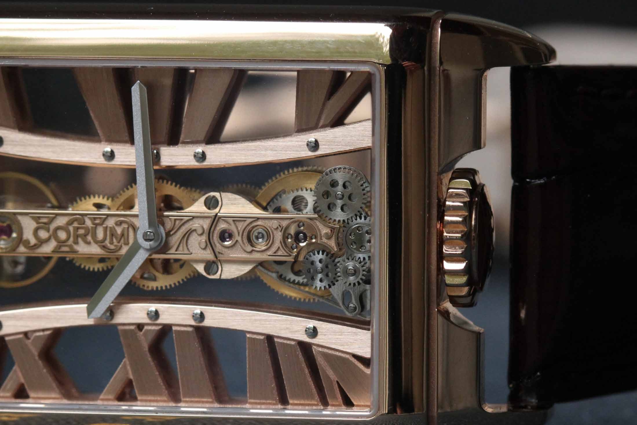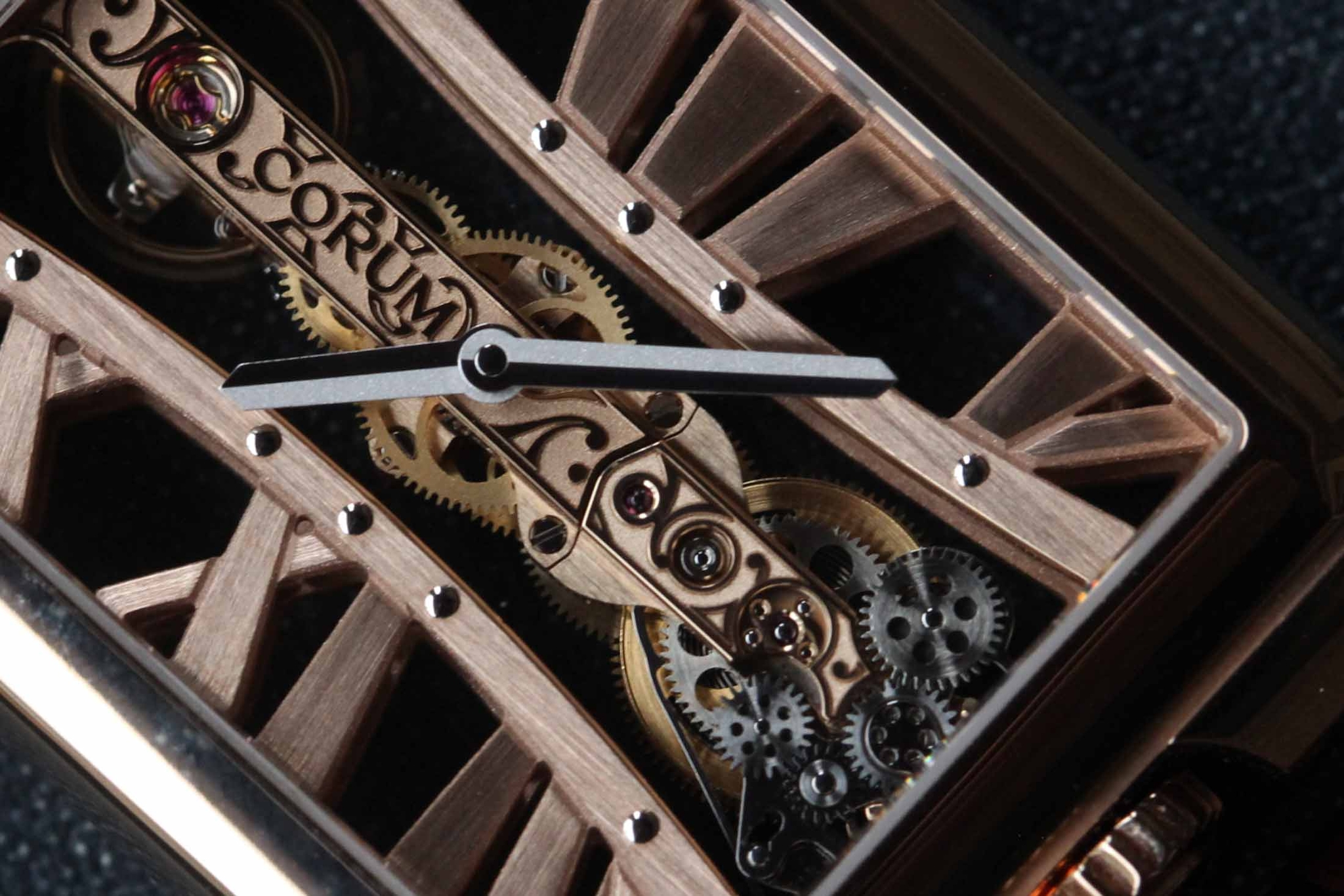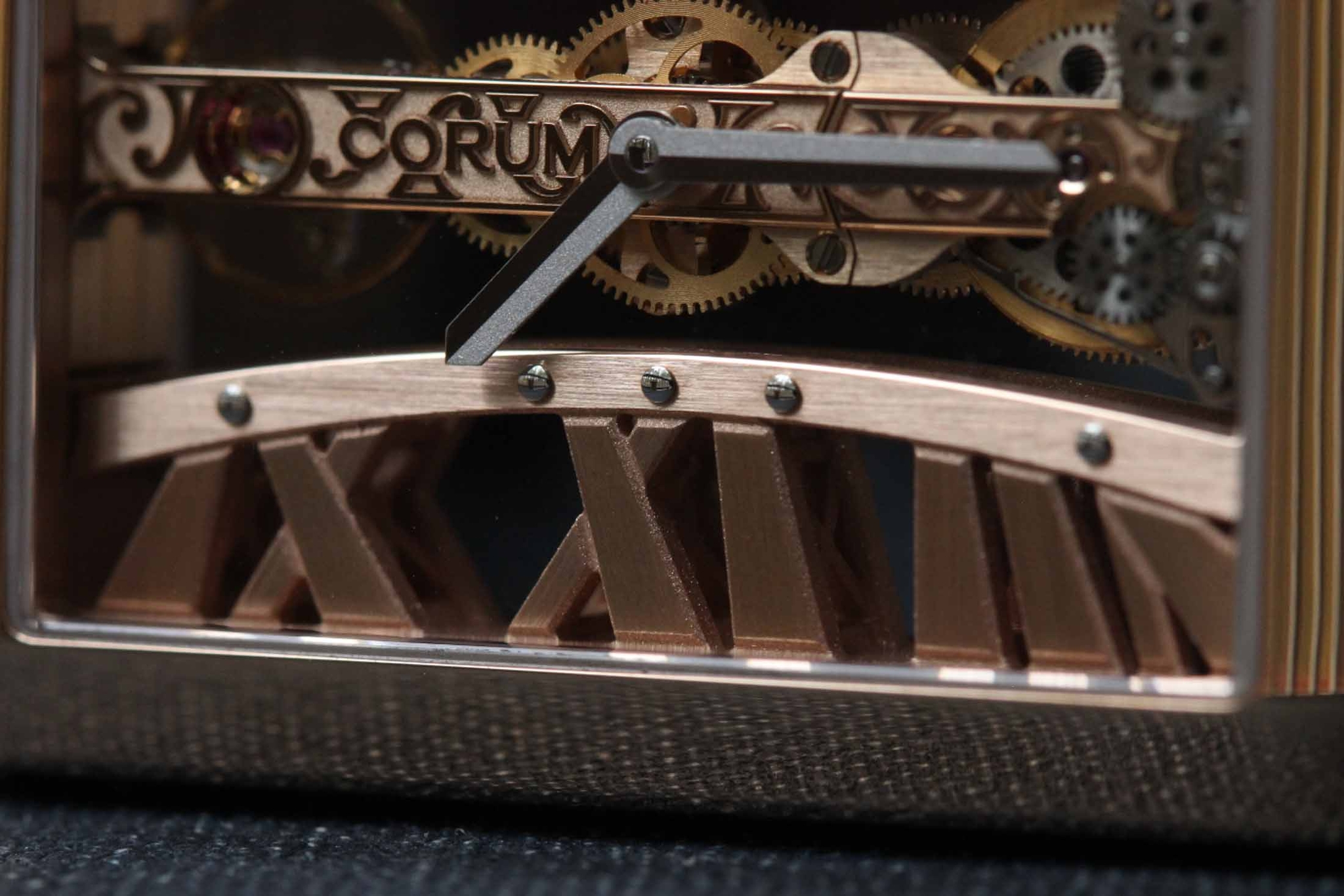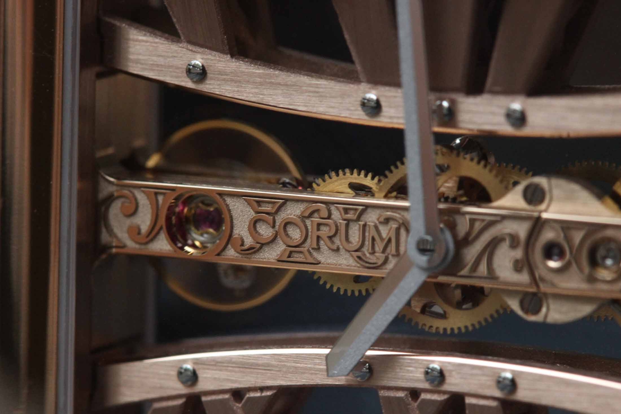 Một ưu điểm khác trên bộ máy đồng hồ hiện tại chính là Corum sử dụng chính tên thương hiệu để trang trí, bên cạnh những họa tiết uốn lượn. Corum đã từng thí nghiệm in tên thương hiệu lên mặt kính sapphire như trên những chiếc đồng hồ Coin của hãng, điều này có thể tăng khả năng xem giờ. Nhưng khi đặt tên thương hiệu vào bộ máy, giới mộ điệu lại một lần nữa tận hưởng cảm giác ấn tượng và kỹ nghệ thủ công đem lại.