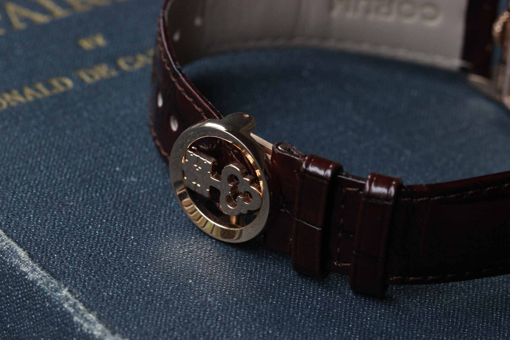 Đi kèm với thiết kế đồng hồ Corum Golden Bridge Rectangle hiện tại là dây đeo bằng da cá sấu màu chocolate cùng khóa gập được làm từ vàng hồng 18k. Vòng tròn bằng vàng với logo Corum khá là dễ nhìn và thương hiệu cũng đã đảm bảo việc hoàn thiện bề mặt ở mức ổn. Tuy nhiên, thực tế việc luồn dây đeo qua khoá lại hơi khó và các lỗ trên dây đeo khá lớn, phần chốt của khóa tương đối lỏng. Dây đeo vẫn chắc chắn nhưng khi đặt đồng hồ lên sàn cứng cần cẩn thận một chút.