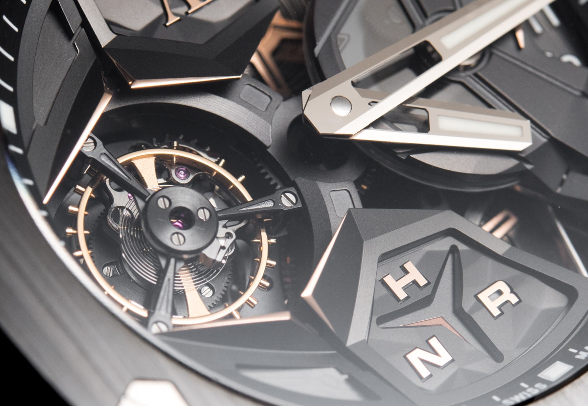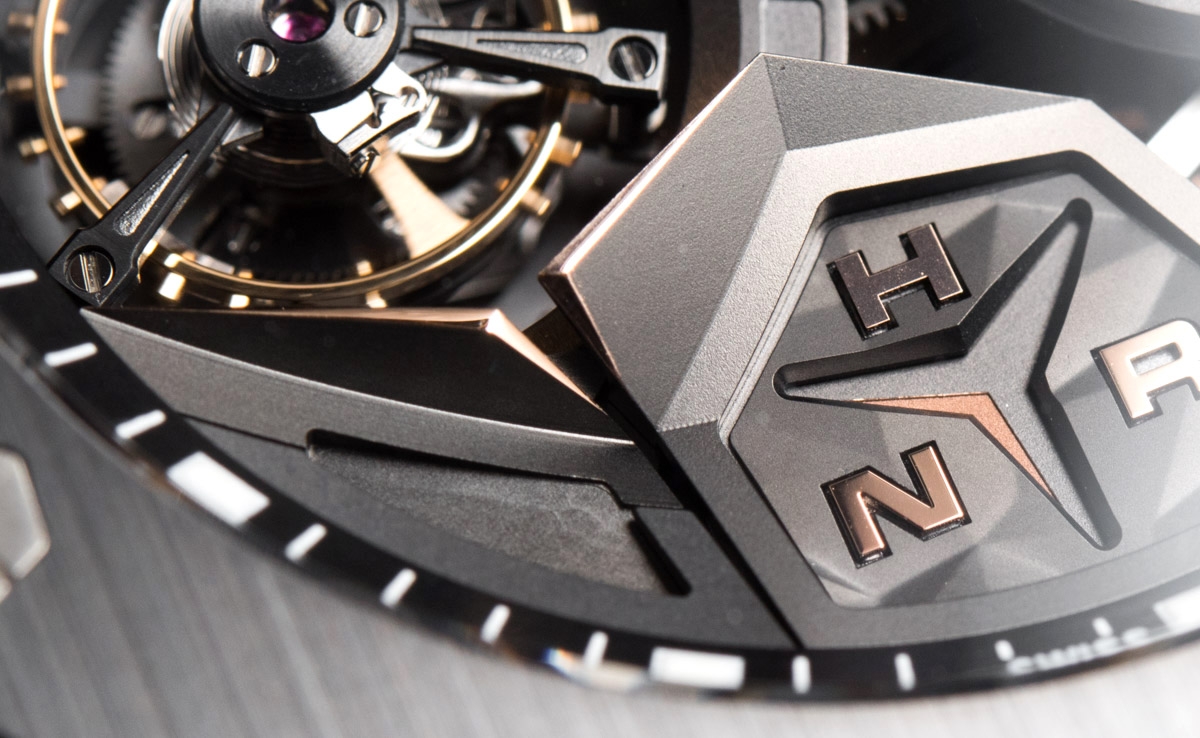 Chiếm một phần diện tích lớn trên mặt số là bộ hiển thị có hình dạng lạ mắt gồm ba chữ H - N - R tại góc 6 giờ trên mặt số đồng hồ. Với những fan hâm mộ đồng hồ truyền thống, bạn sẽ khó lòng biết 3 chữ cái này đại diện cho điều gì. Còn với những ai có cơ hội tiếp xúc với đồng hồ hiện đại của nhiều thương hiệu mới như Richard Mille hay Audemars Piguet, điều này không làm khó được bạn. Bộ ba chữ H, N. R đại diện cho trạng thái hiện thời của núm vặn điều chỉnh. H là viết tắt của chữ “heures", nghĩa là giờ trong tiếng Pháp, và khi ở trạng thái này, núm vặn sẽ dùng để thiết lập thời gian (điều chỉnh bộ kim). Chữ N viết tắt cho neutre (trung tính), khi đó, mọi chức năng đều đã được thiết lập ổn thỏa trong khi chữ R viết tắt cho remontoir (winder), lúc này đây, người dùng đã có thể lên cót cho bộ máy đồng hồ.