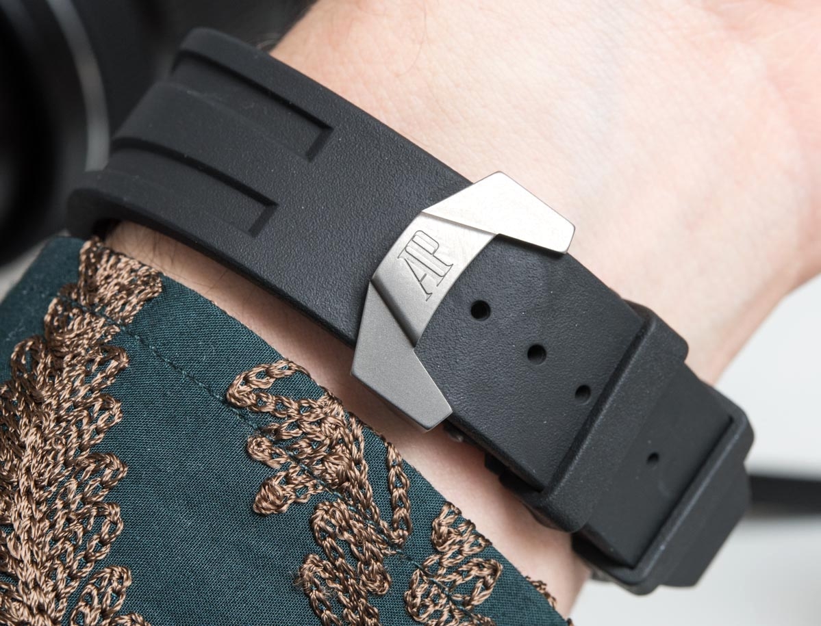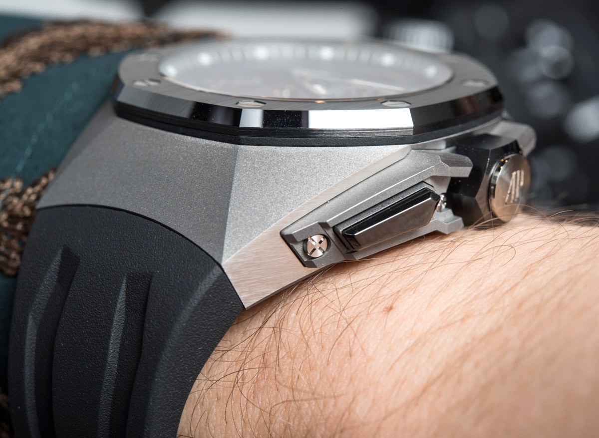 Một trong những điểm mới trên dòng đồng hồ Royal Oak Concept GMT / tourbillon là bộ phận bảo vệ núm vặn cùng các nút bấm đã được thay đổi kiểu dáng sang góc cạnh hơn kiểu dáng tròn cũ. Nút bấm trên đồng hồ sẽ đẩy kim GMT lên một nấc.