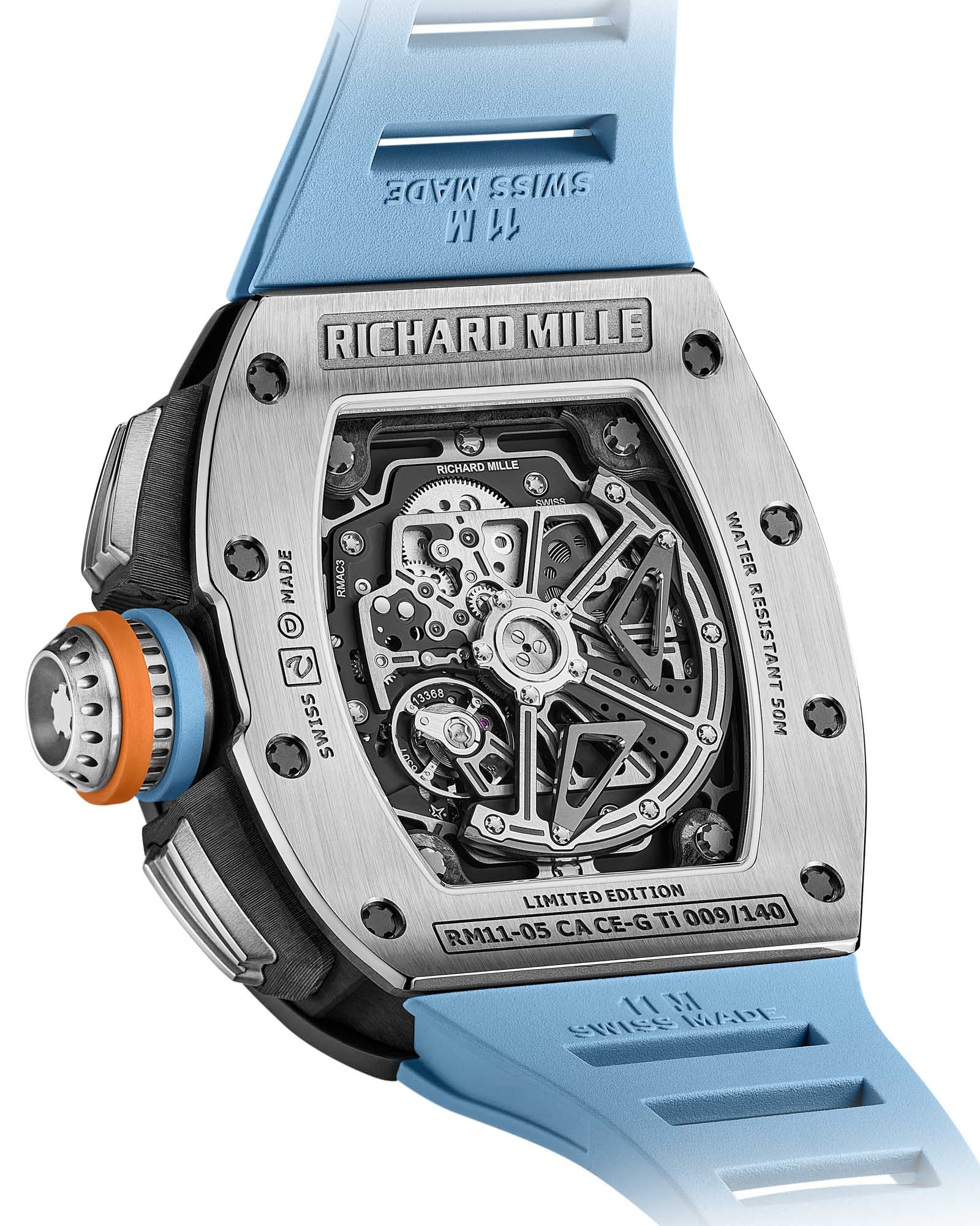 Với mẫu đồng hồ RM 11-05 hiện tại, thương hiệu Richard Mille sử dụng bộ máy RMAC3 có chức năng fly-back chronograph kèm bộ hiển thị lịch thường niên và chức năng GMT. Khả năng trữ cót của chiếc đồng hồ này là 50 giờ (+/-10%) cùng tần số 28.800 vph.
