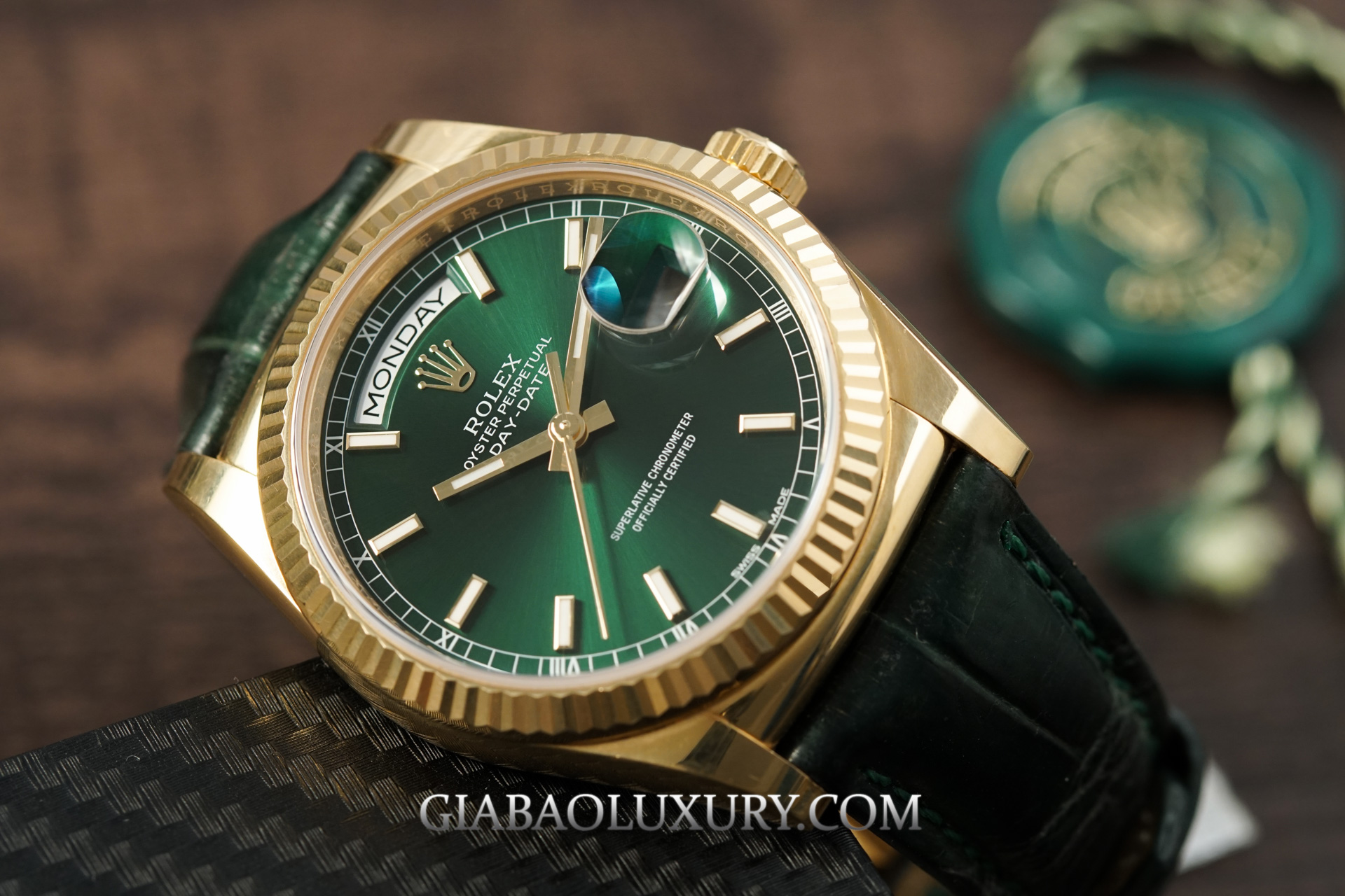 Tiếp theo trong danh sách mà Gia Bảo Luxury muốn đề cập là mẫu đồng hồ có mã hiệu 18038. Phiên bản Rolex Day-Date này mới hơn một thế hệ so với phiên bản trước đó ref. 1803. Rolex Day-Date ref. 18038 được trang bộ máy tự lên dây cót 3055, với tần số dao động cao hơn 28.800bph. Model này cũng tự hào có chức năng Single Quickset tiện lợi.