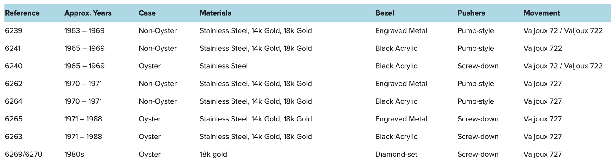 - 1964: Chữ Daytona xuất hiện tại góc 12 giờ trên mặt số đồng hồ