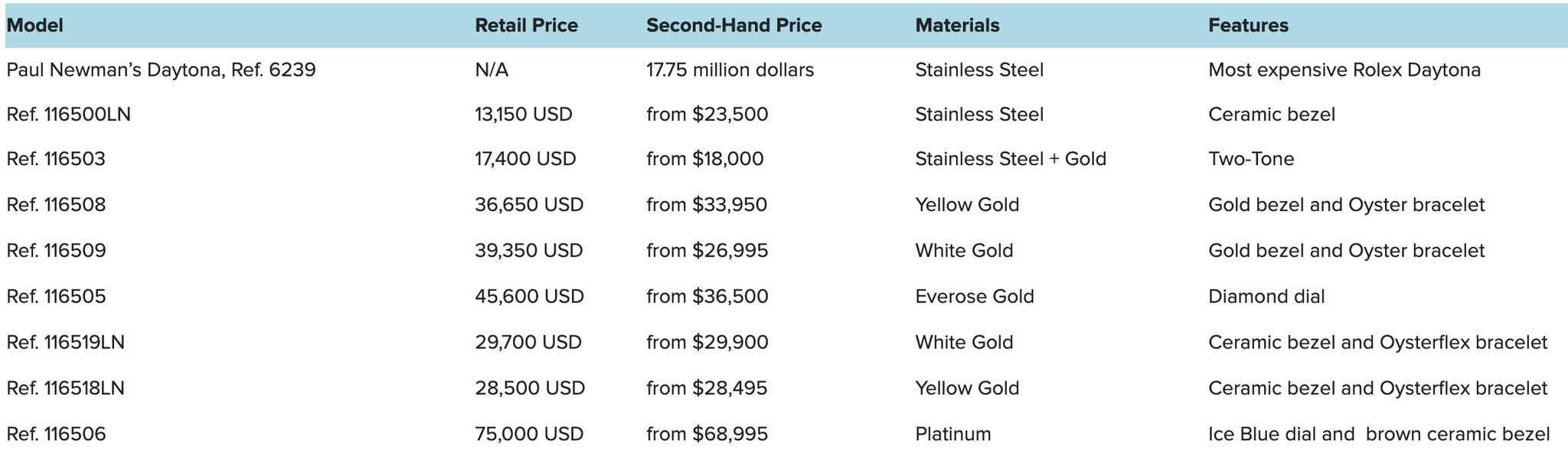 Trên thị trường đồng hồ đã qua sử dụng, giá của thế hệ đồng hồ Daytona bằng thép không gỉ bắt đầu từ khoảng 15.000 USD khi mua đã qua sử dụng. Nói chung, các mẫu Daytona cổ điển là đắt nhất do mức độ sưu tầm cao, thậm chí có những mẫu thép không gỉ khiêm tốn nhất được bán với giá cao hơn giá của một chiếc Daytona vàng nguyên khối hoàn toàn mới.