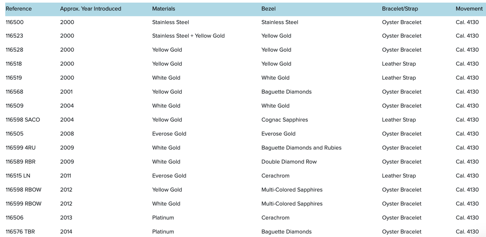 - 2000: Thế hệ thứ ba của đồng hồ Daytona xuất hiện cùng bộ máy chronograph tự động đầu tiên do Rolex sản xuất