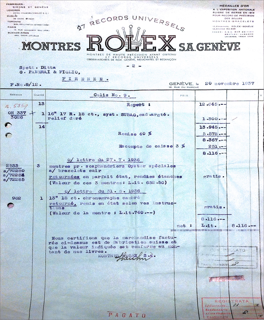Hóa đơn bên dưới ghi ngày 20/11/1937, với nội dung bảo hành miễn phí cho ba chiếc đồng hồ bị vào nước. Như vậy, chúng ta thấy được rằng những mẫu Panerai đầu tiên vẫn có rất nhiều vấn đề về khả năng chống nước.