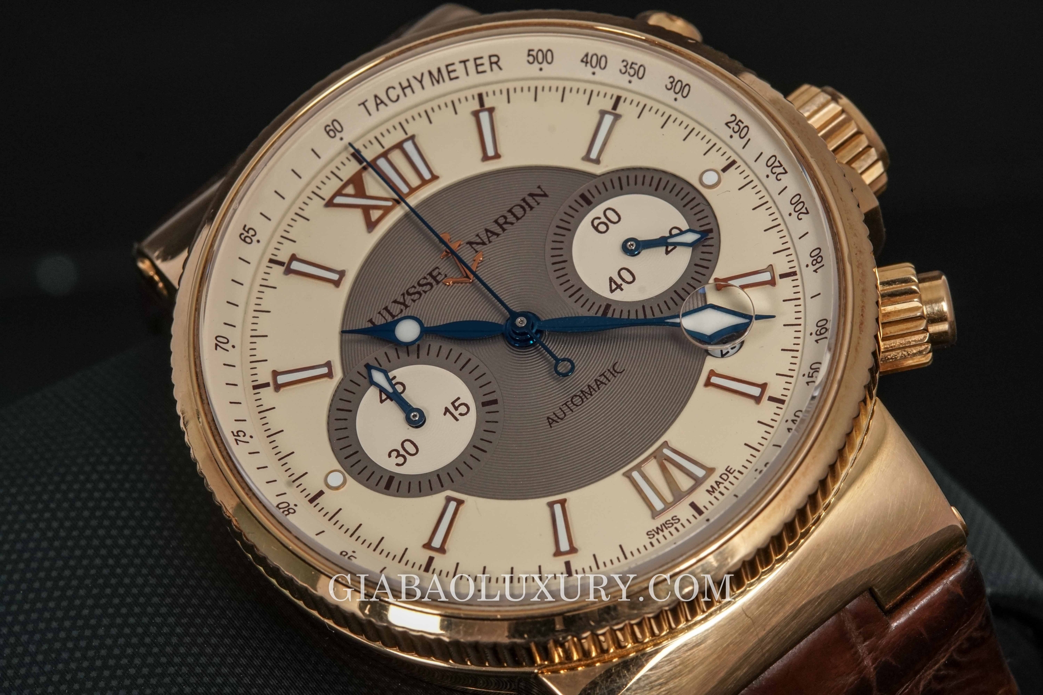 Ulysse Nardin Marine Chronograph có lớp vỏ được làm từ vàng hồng nguyên khối với kích thước 41mm, dày 14.5mm. Với kích cỡ khá lớn, rất phù hợp với cổ tay của anh Hưởng. Kết hợp với bộ vỏ vàng hồng là bộ khóa bấm cùng chất liệu và dây da cá sấu nâu. Hai chất liệu vàng hồng - da cá sấu có lẽ sinh ra để kết hợp với nhau trên những chiếc đồng hồ cao cấp.