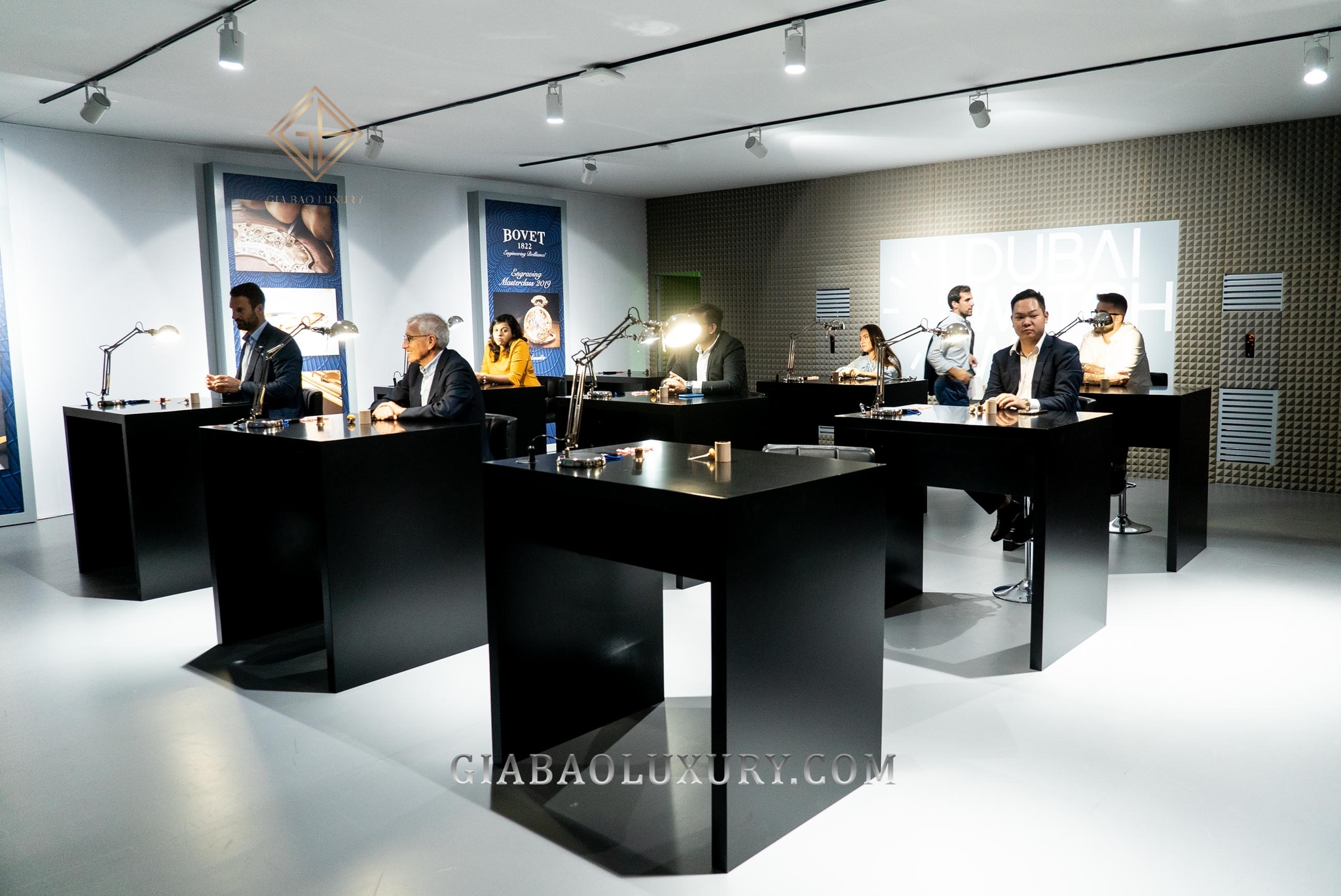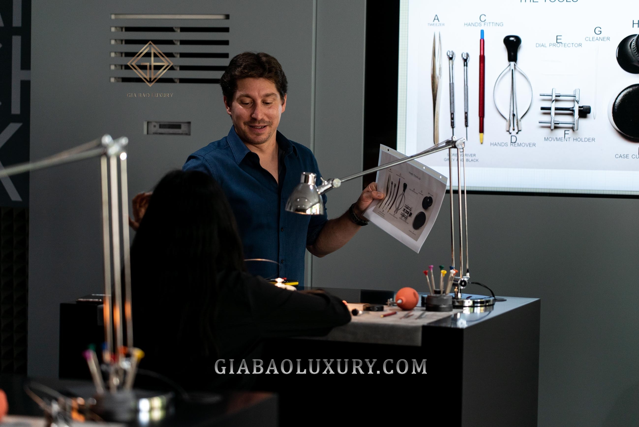 Master Classes được chia làm 2 phòng riêng mang tên Watch Making và Watch Craft. Mỗi một tiết học sẽ được những nghệ nhân giới thiệu và hướng dẫn thực hành trong 1 giờ đồng hồ. Gia Bảo có tham dự 3 khoá học bao gồm Chạm khắc của Bovet, tháo lắp một cỗ máy tự động của Antoine Preziuso và chế tạo dụng công cụ bởi Alco.
