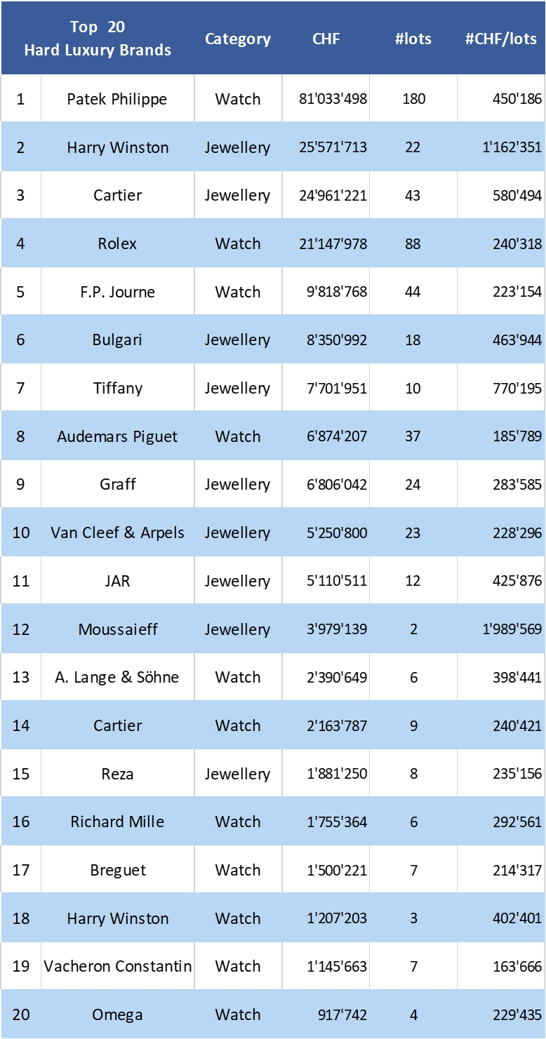 Khi bàn đến đồng hồ của các thương hiệu trong cuộc đấu giá, cái tên Patek Philippe đã thống trị về mặt doanh số đồng hồ được bán ra bởi các đơn vị Antiquorum, Bonhams, Christie's, Poly Auction, Sotheby's và Phillips. 81 triệu CHF là giá trị đồng hồ Patek Philippe được bán ra trong các cuộc đấu giá, cao hơn gần 4 lần doanh số thu được nhờ bán đồng hồ Rolex (21 triệu CHF).