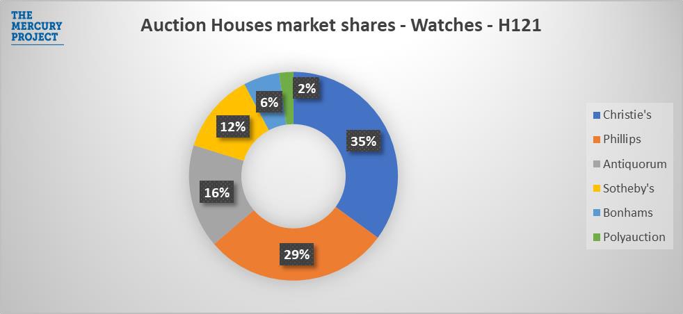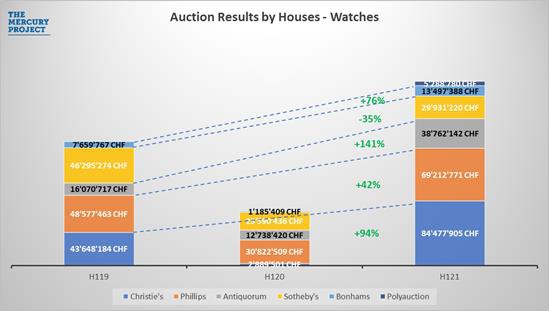Trong nửa đầu năm 2021, doanh số bán hàng của Christie’s là 84,5 triệu CHF, gần gấp đôi giá trị đồng hồ bán được trong nửa đầu của năm 2019. Sự tích cực này đã khiến Christie's vượt qua Phillips trở thành nhà đấu giá đồng hồ lớn nhất thế giới.