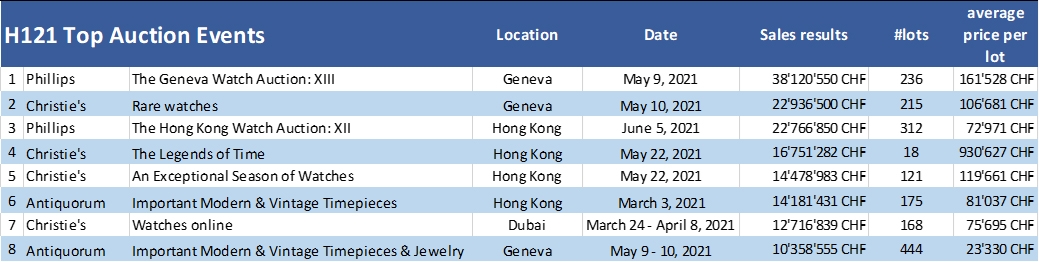 Bảng thể hiện: 8 Sự kiện đấu giá thu về doanh số hơn 10 triệu CHF, 4 trong số đó được tổ chức bởi đơn vị Christie's, 2 được tổ chức bởi đơn vị Phillips và 1 của Antiquorum
