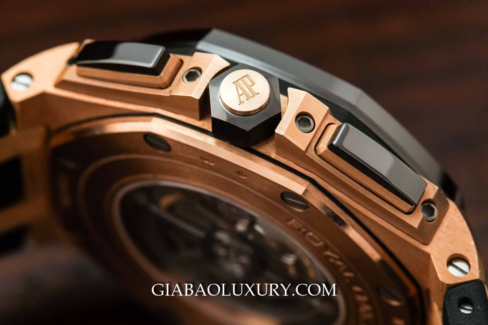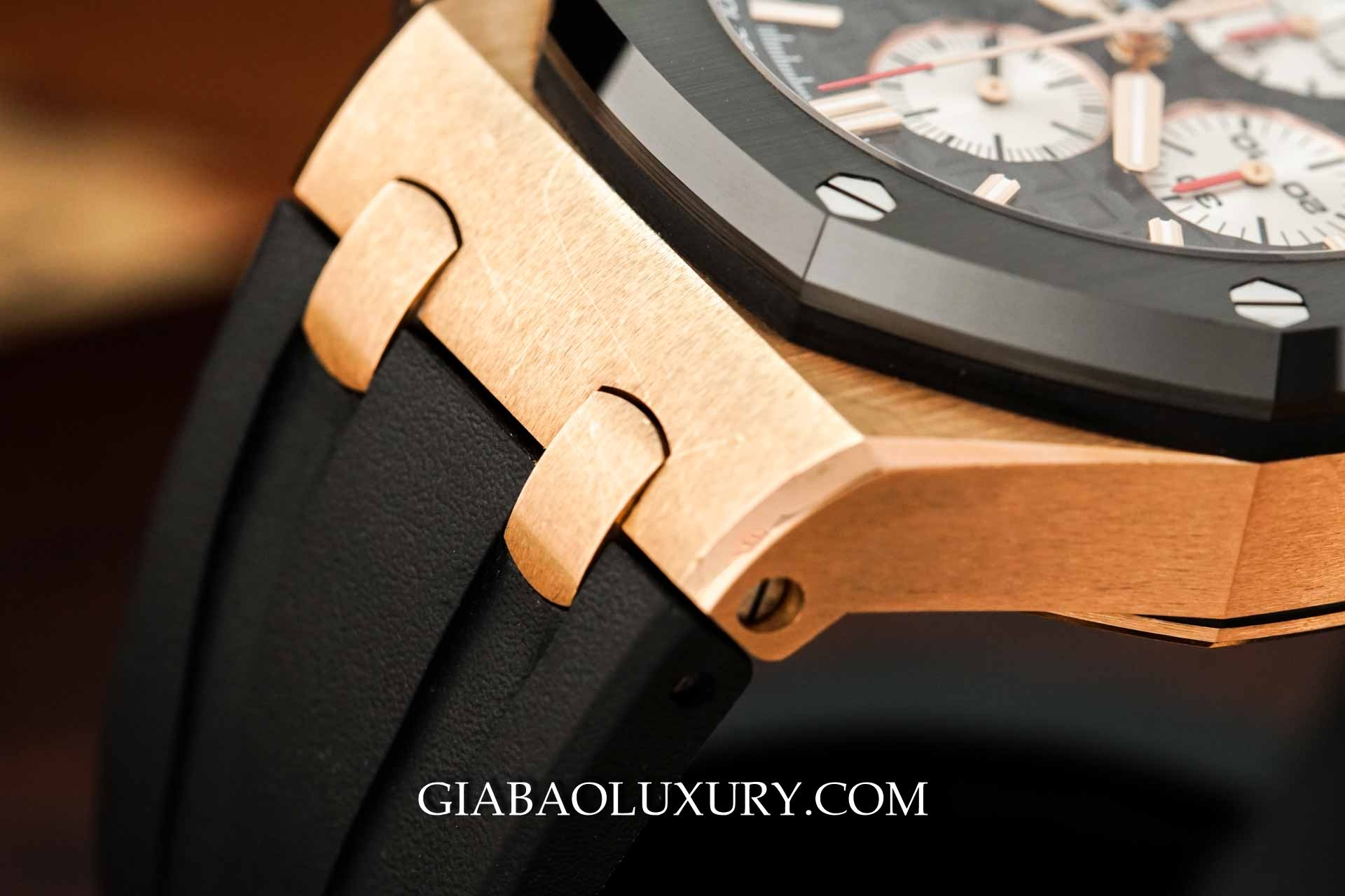 Chất liệu Ceramic cũng được sử dụng trên vành bezel - thiết kế biểu tượng vẫn được giữ nguyên từ Royal Oak. Tám chiếc đinh ốc quen thuộc được sắp xếp thẳng hàng luôn là thứ mê hoặc những người yêu đồng hồ, có tác dụng cố định vành bezel được hoàn thiện chải xước. Có thể nói rằng việc kết hợp hai tông màu vàng hồng - đen của Audemars Piguet đã cho ra một thiết kế cực kỳ ấn tượng - thanh lịch nhưng không kém phần mạnh mẽ.