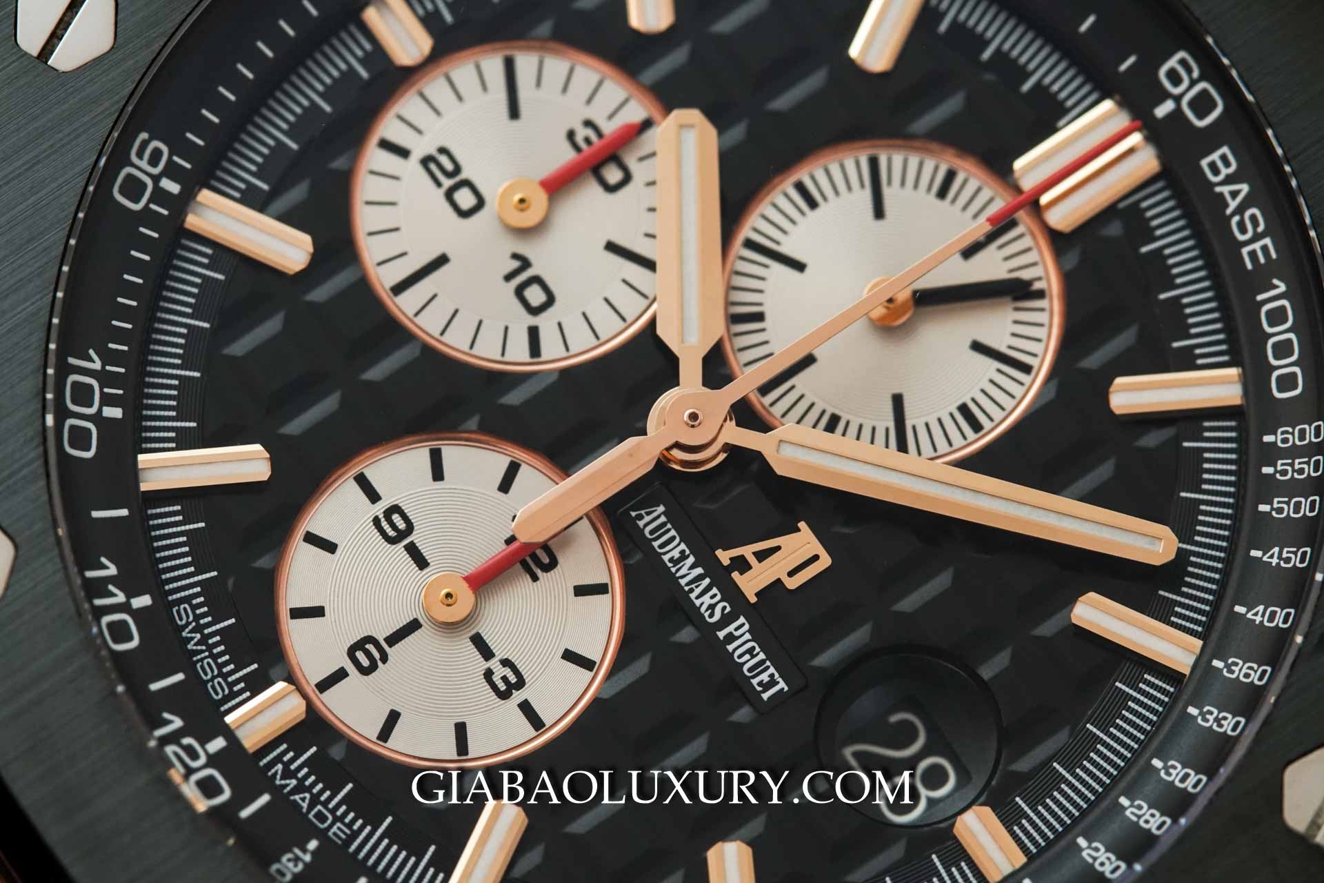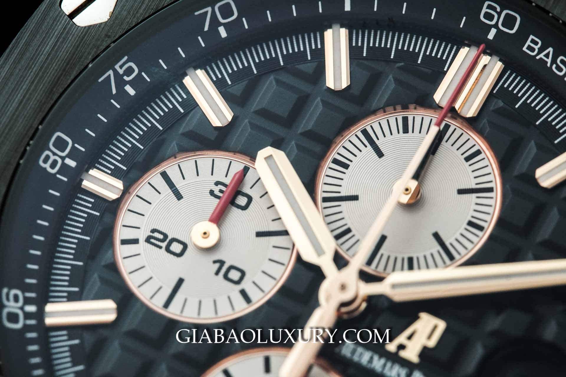 Chúng ta vẫn có họa tiết Méga Tapisserie quen thuộc, cửa sổ ngày được trang bị kính lúp phóng đại và vành Tachymeter ở viền ngoài mặt số. Tuy nhiên, nếu so sánh với chiếc Royal Oak Offshore "Elephant" mà Gia Bảo Luxury đã giới thiệu trong bài viết này, thang Tachymeter của mẫu "Big Boy" có vẻ rối mắt hơn, do có quá nhiều chữ số sát nhau.