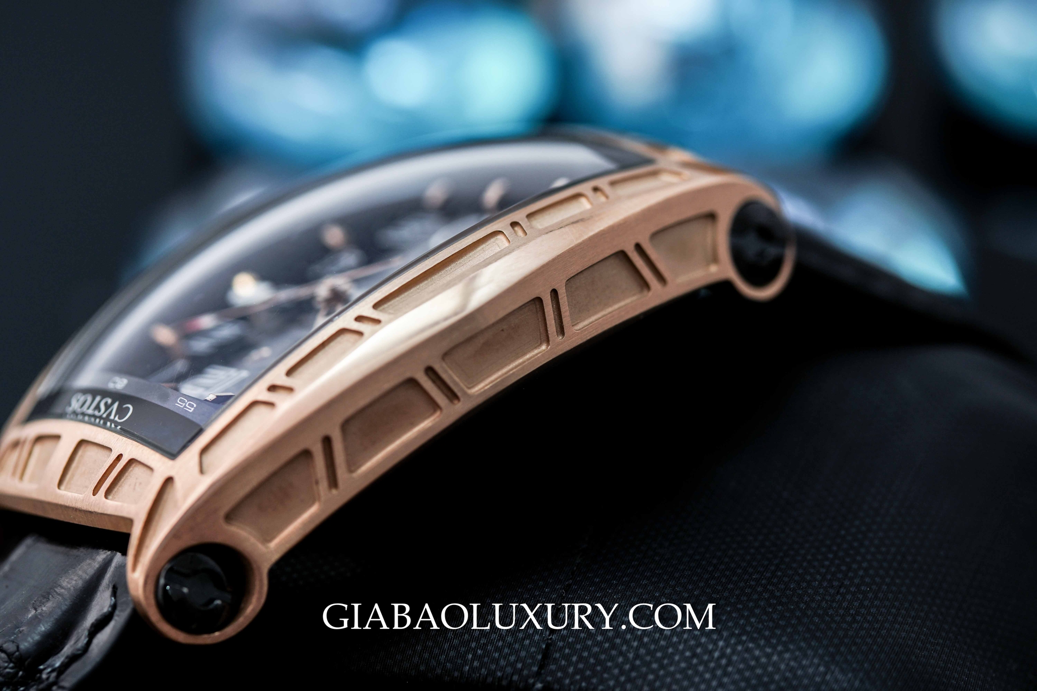 Chiếc đồng hồ sở hữu mặt số dáng tonneau kích thước 41x53mm, xu hướng hot trong những năm gần đây cùng dây da cá sấu cổ điển. Là một thiết kế đồng hồ có phong cách đặc biệt, Cvstos Challenge Jet-Liner SL sử dụng chất liệu vàng hồng đặc biệt. Chất liệu vàng hồng của Cvstos Challenge Jet-Liner SL lần này có tên gọi Bicolor 5N Red Gold, một chất liệu đặc biệt của Cvstos được sản xuất và hoàn thiện theo công nghệ chuyên biệt, khiến chiếc đồng hồ có một độ bóng lì hoàn hảo. Phương pháp đánh bóng sử dụng cho bộ vỏ đồng hồ này hạn chế tối đa va chạm gây ra xước ở những vị trí góc cạnh vành bezel, bộ khóa hay núm chỉnh giờ.