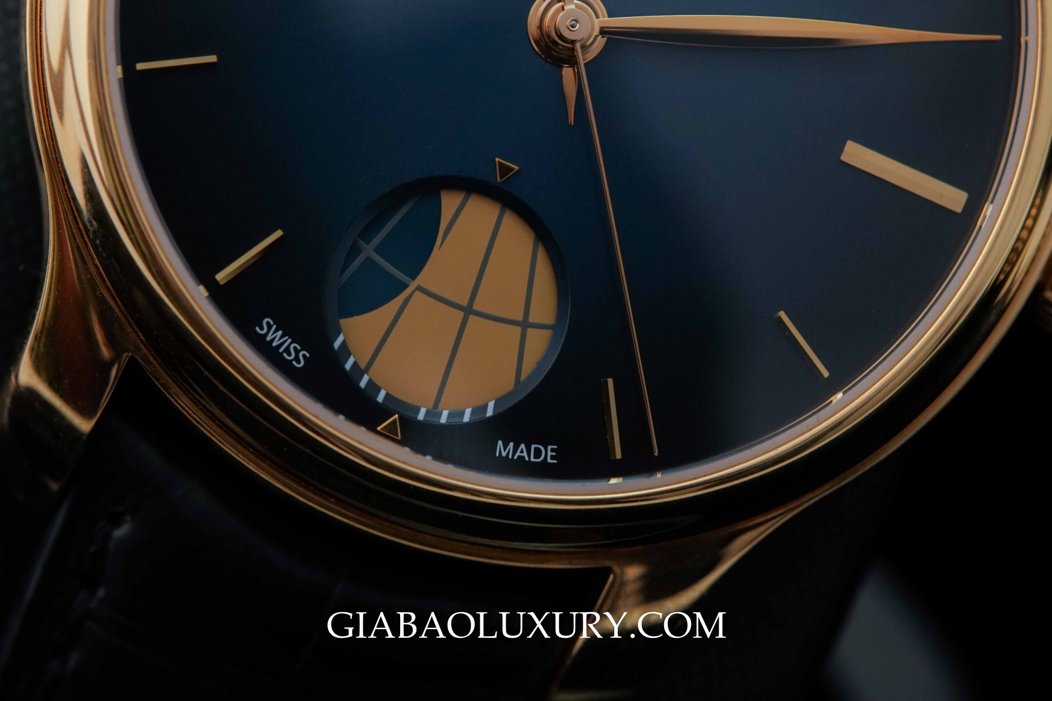 Và nếu hỏi tôi, hay hỏi 10 người khác, khi nhìn vào chiếc H. Moser & Cie Endeavour Moon, chi tiết nào gây ấn tượng nhất? Chắc chắn câu trả lời: chi tiết ấn tượng nhất nằm tại mặt số phụ góc 6 giờ. Tại vị trí 6 giờ là lịch tuần trăng, được phác họa bằng hai màu tương phản: màu xanh của đêm và màu vàng nổi bật của mặt trăng.