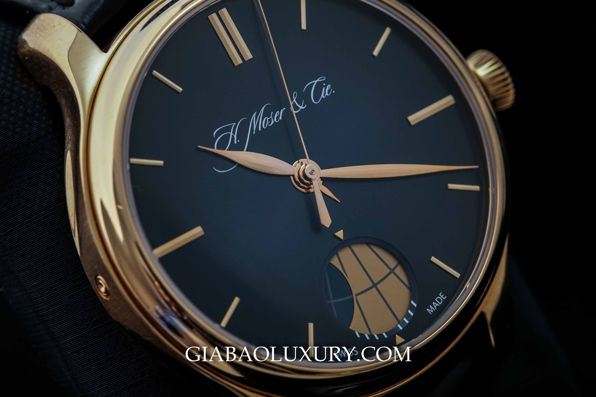 Có chiếc đồng hồ H. Moser chỉ còn độc kim giờ và kim phút (chiếc H. Moser Purity phiên bản kỉ niệm nước Nga với mặt số khói màu đỏ), còn chiếc H. Moser & Cie này bố cục không đến nỗi đơn giản đến thế.