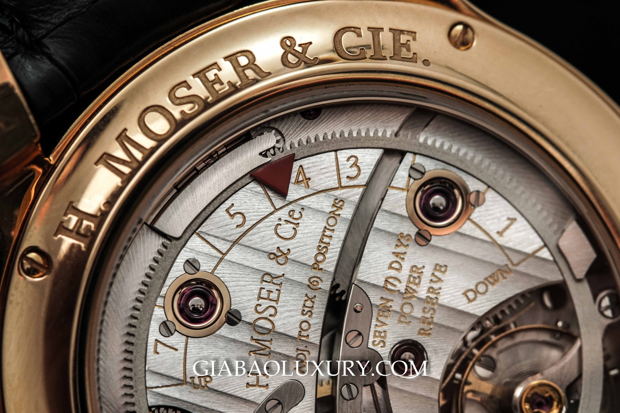 Nếu để ý kĩ H. Moser đã làm mờ mặt số bằng những đường xước tinh tế đối xứng ở tâm và tỏa dần ra viền, quả là xứng đáng với kĩ thuật thượng thừa của nhà chế tác có nguồn gốc gần 200 năm. Cũng thuộc bộ khung, càng nối dây được thiết kế dạng cong cũng được đánh bóng tạo vẻ đẹp hiện đại cho cả mẫu đồng hồ. Đặc biệt, càng nối dây có một chút vị lạ khi nhà sản xuất sử dụng một đường “khoét eo” để tạo cảm giác mềm mại chăng?