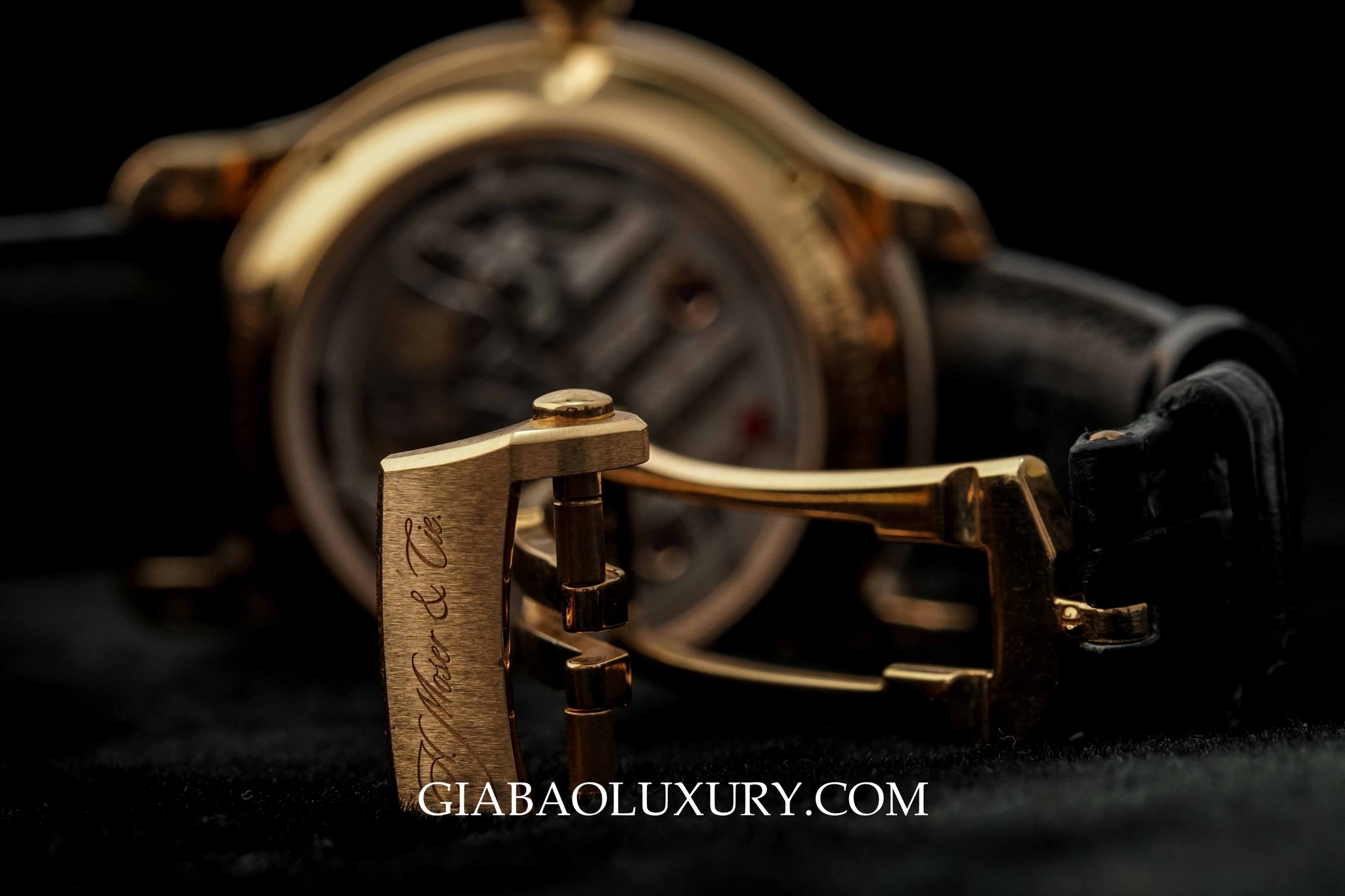 Kết hợp với mặt số xanh ấn tượng, là dây đeo da cá sấu có màu đen huyền bí, đem lại vẻ ngoài khỏe khoắn, trên một tổng thể hoài cổ. Với thiết kế H. Moser & Cie Endeavour Moon, nhà sản xuất sử dụng dây đeo dạng khóa gập cũng trong chất liệu vàng hồng, có khắc logo H. Moser & Cie thủ công.