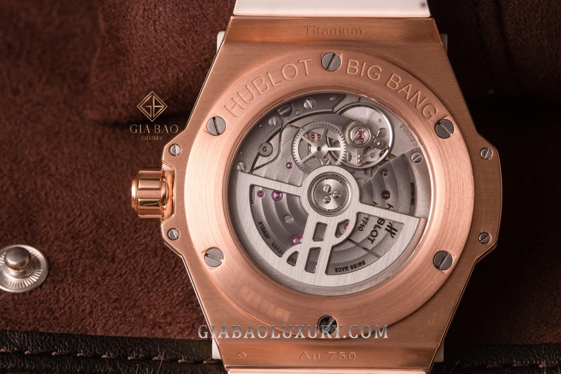 Bộ vỏ đồng hồ vàng King Gold được phối hợp với dây đeo cao su màu trắng có họa tiết nổi khiến Hublot Big Bang 465.oe.9010.rw.1604 trở nên chắc tay với nữ giới. Với những cô gái đã quen đeo lắc tay nhẹ nhàng, thì có thể mẫu đồng hồ này trong thời gian mới đeo lên tay sẽ cho cảm giác lạ lẫm vì nó “nặng”. Nhưng không sao hết, thời gian sẽ cho các quý cô câu trả lời thực tế, Hublot Big Bang 465.oe.9010.rw.1604 là một thiết kế tuyệt vời về cả cân nặng lẫn tỉ lệ.