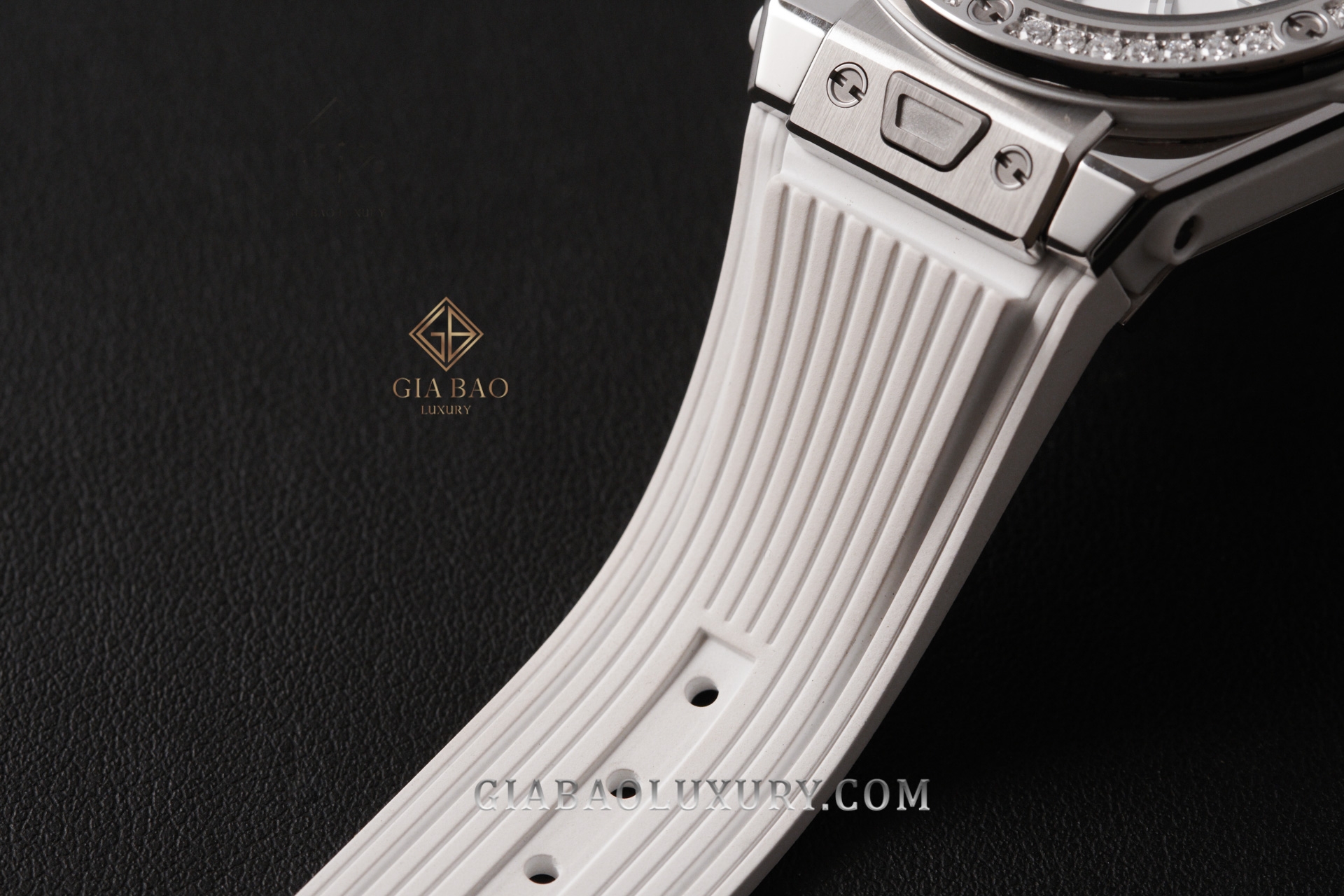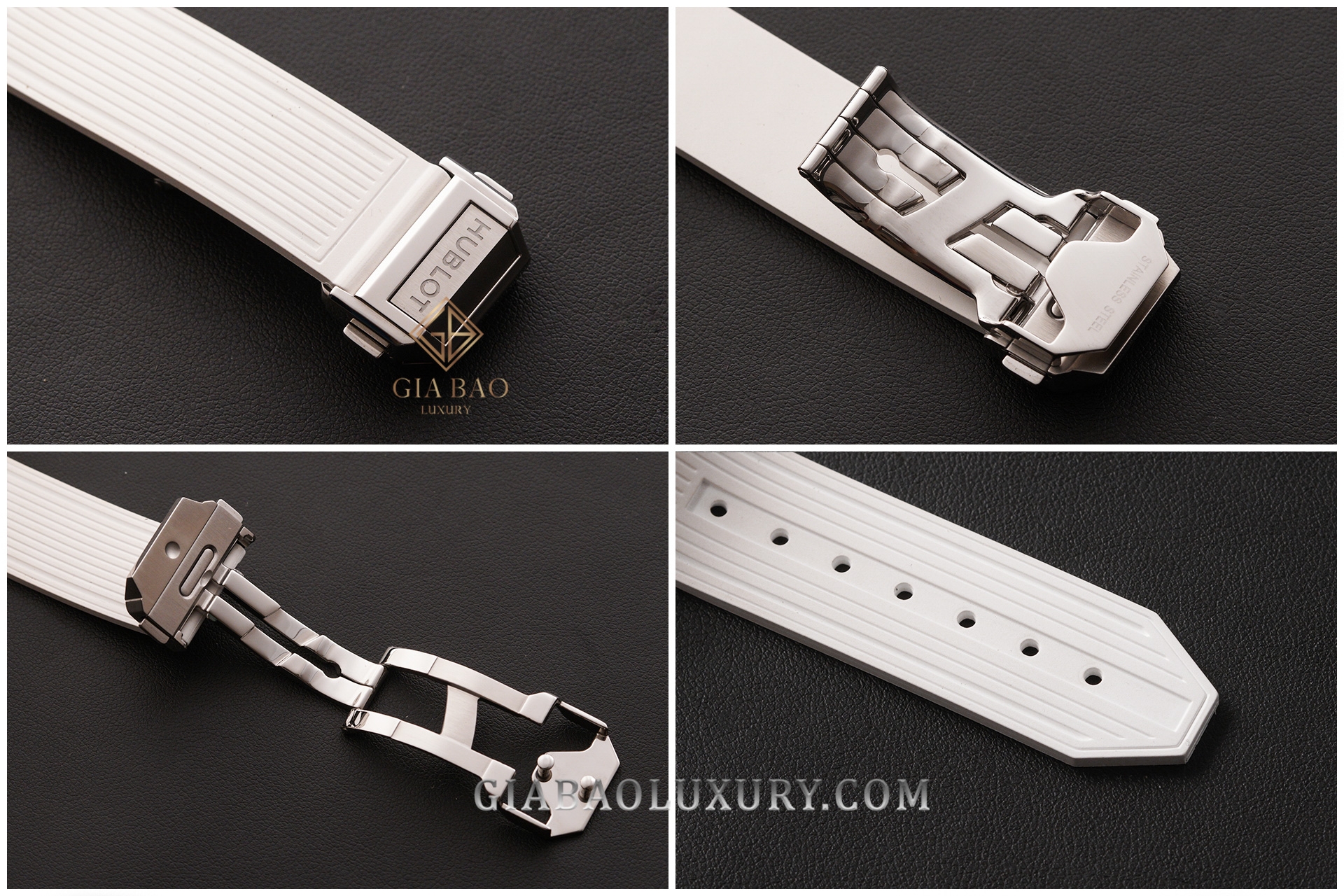 Lần đầu xuất hiện trên thị trường, Hublot đã trang bị dây đeo cao su cho chiếc đồng hồ Big Bang của mình. Dây đeo cao su của đồng hồ Hublot Big Bang mang tính biểu tượng và khởi nguồn cho nhiều thương hiệu khác sử dụng loại dây này. Hublot chính là thương hiệu tiên phong sử dụng dây đeo cao su trong đồng hồ xa xỉ. Hiện thời những chiếc đồng hồ thép không gỉ và dây đeo cao su như Patek Philippe Aquanaut hay Richard Mille và cả Hublot Big Bang rất được giới trẻ ưa thích vì sự trẻ trung và tiện dụng. Dây đeo cao su hiện chống nước tốt nhất khi so với dây đeo kim loại và dây đeo từ da. Kết thúc phía cuối dây đeo của chiếc đồng hồ Hublot Big Bang One Click Steel White Diamonds này là khóa cài từ thép không gỉ đã được đánh bóng phần mặt trong trong khi mặt ngoài bao quanh chữ Hublot lại được chải xước mờ.