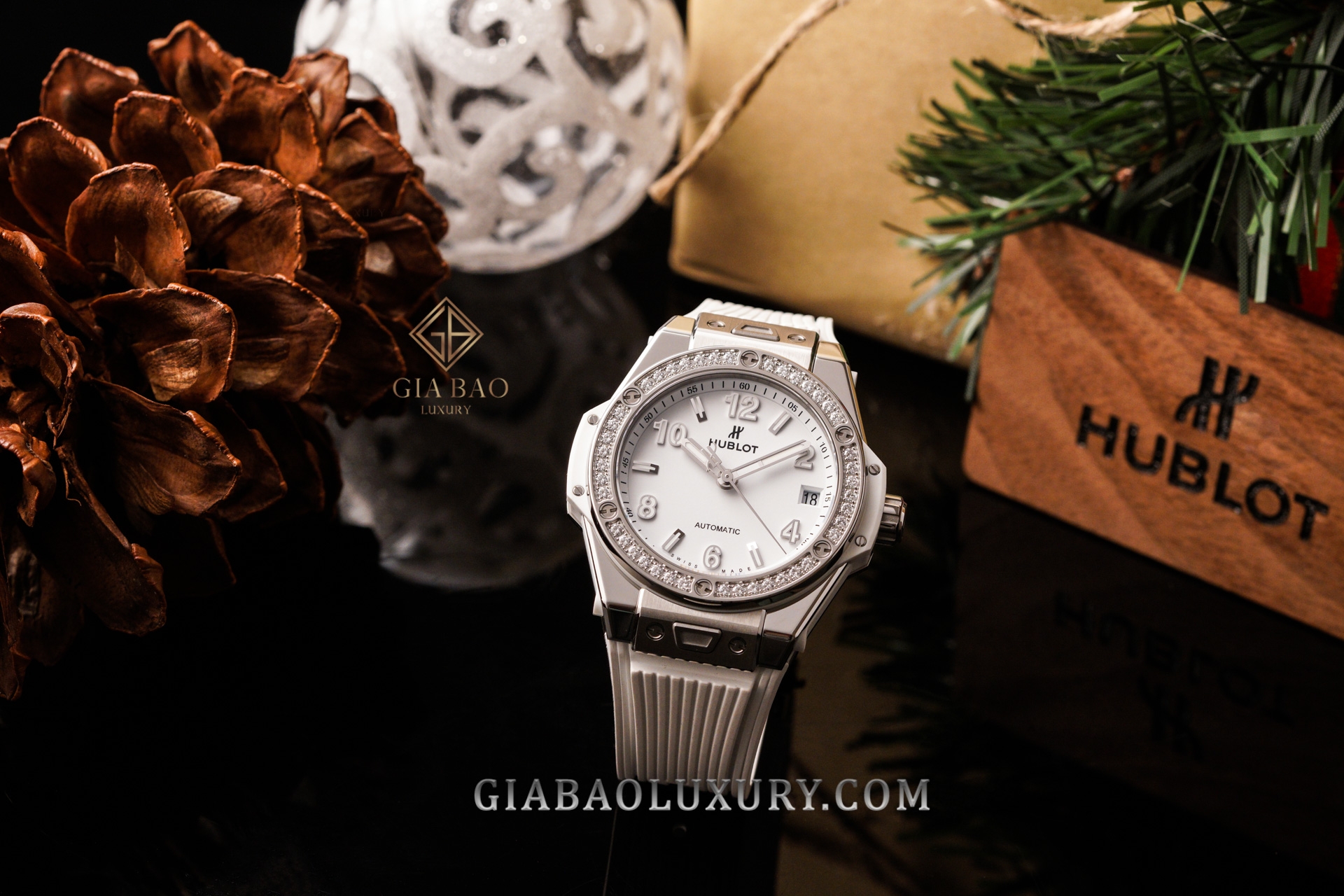 Hublot không công bố chính thức mẫu đồng hồ Hublot Big Bang 39mm chỉ dành cho nữ giới, đây đơn thuần là ý hiểu ngầm của công chúng sau khi hãng giới thiệu tới nhiều mẫu đồng hồ kích thước lớn hơn từ 41mm, 42mm, 44mm hay 45mm. Hublot Big Bang One Click 39mm giữ nguyên những yếu tố đặc trưng chỉ có trên đồng hồ Hublot Big Bang dành cho nam giới và được thêm vào phân lượng lớn đá quý để làm chiều lòng phái nữ. Đặc biệt, mẫu đồng hồ được đánh giá chi tiết trong bài viết này đây còn được thêm vào hai chữ là “One Click” để ám chỉ một cơ chế mới, khác với nhiều chiếc Hublot Big Bang thông thường như Hublot Big Bang Aspen Chronograph 41mm 341.CW.230.RW.194 và Hublot Big Bang Gold Diamonds 44mm 301.PB.131.RX,.