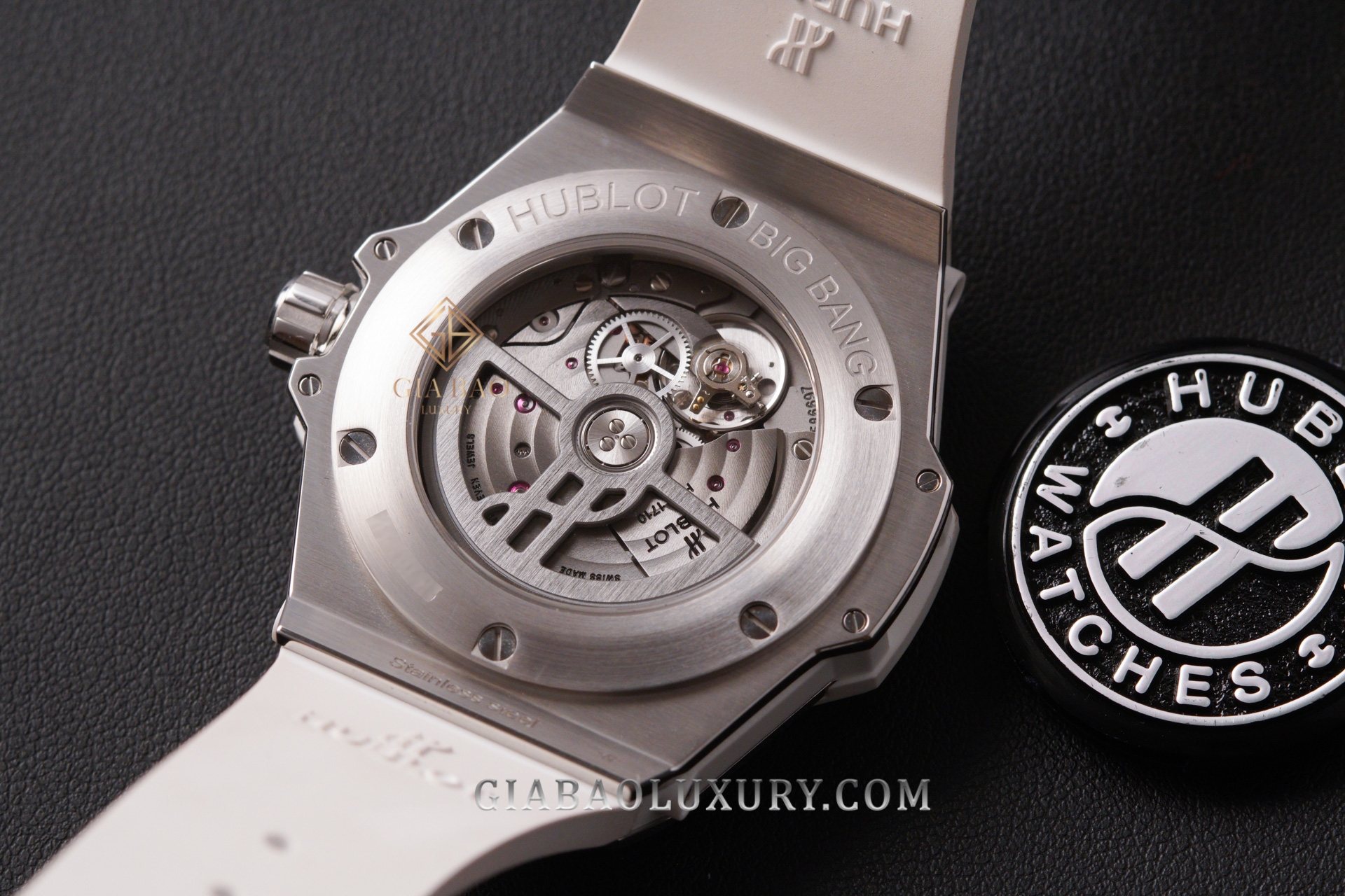Bên dưới mặt kính sapphire phẳng phiu, có thể chống lóa là mặt số của chiếc đồng hồ Hublot Big Bang One Click Steel White Diamonds. Mặt số hiện lên với dáng tròn truyền thống nhưng các chi tiết bên trong lại rất hiện đại. Mặt số màu trắng không bị lai tạp với bất kỳ màu nào khác.