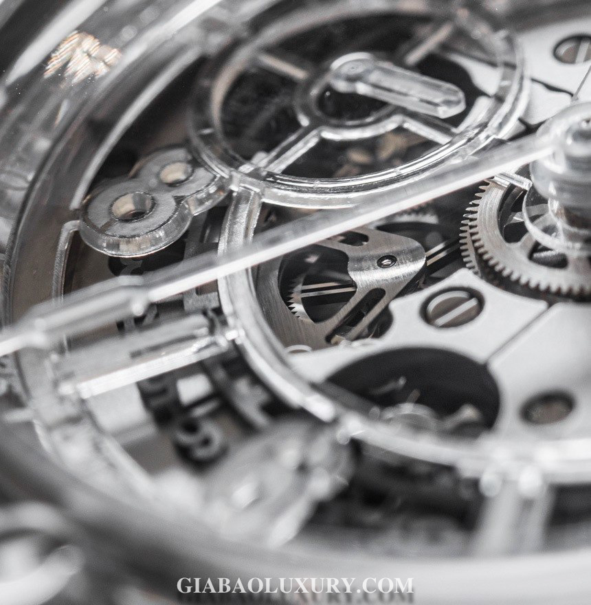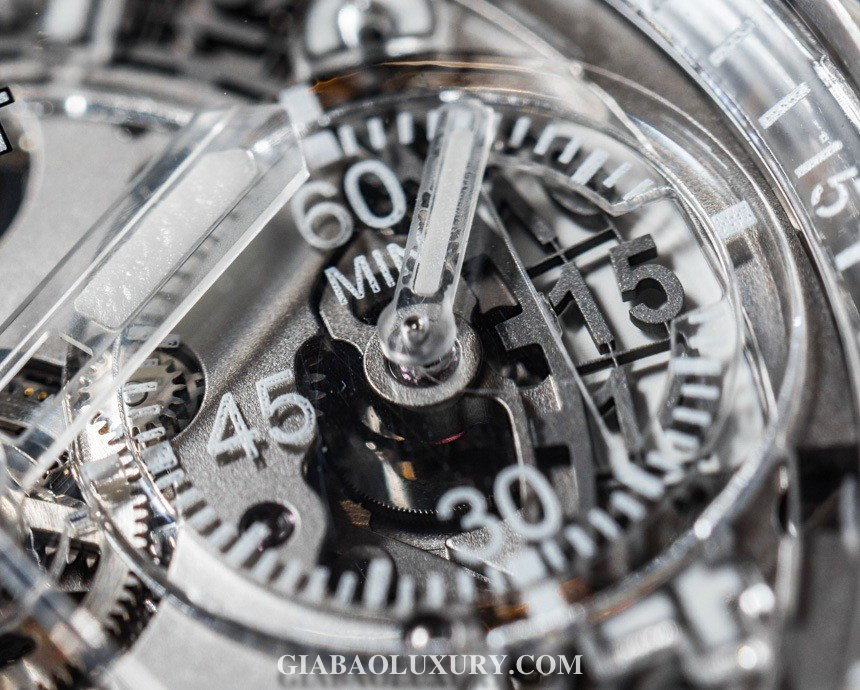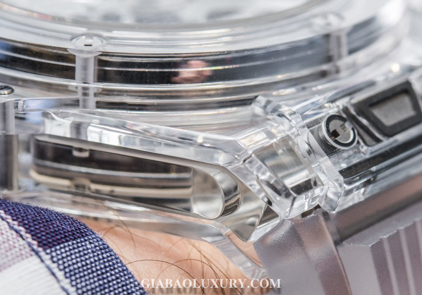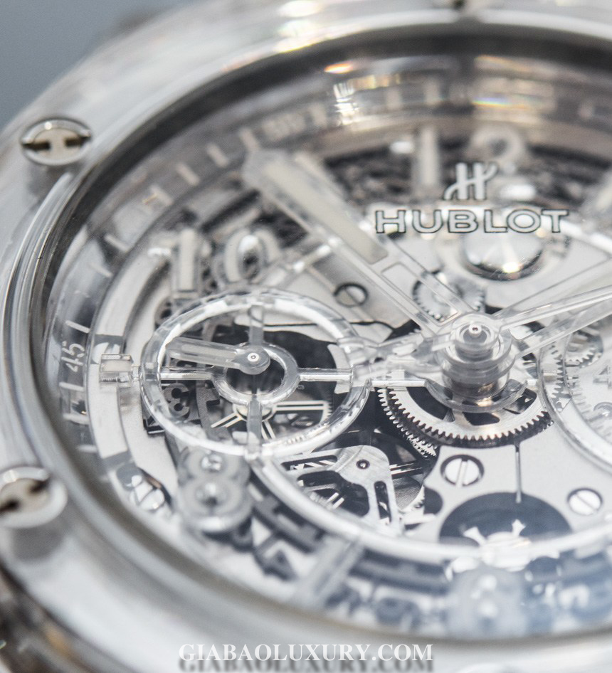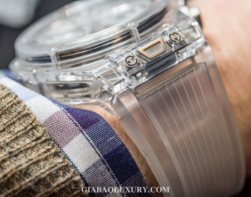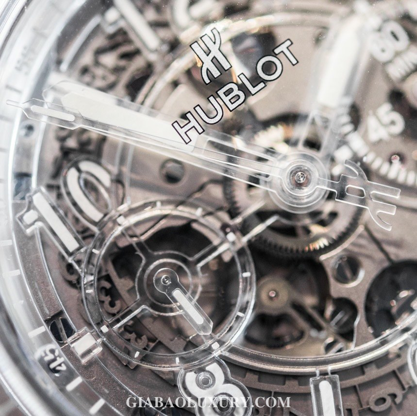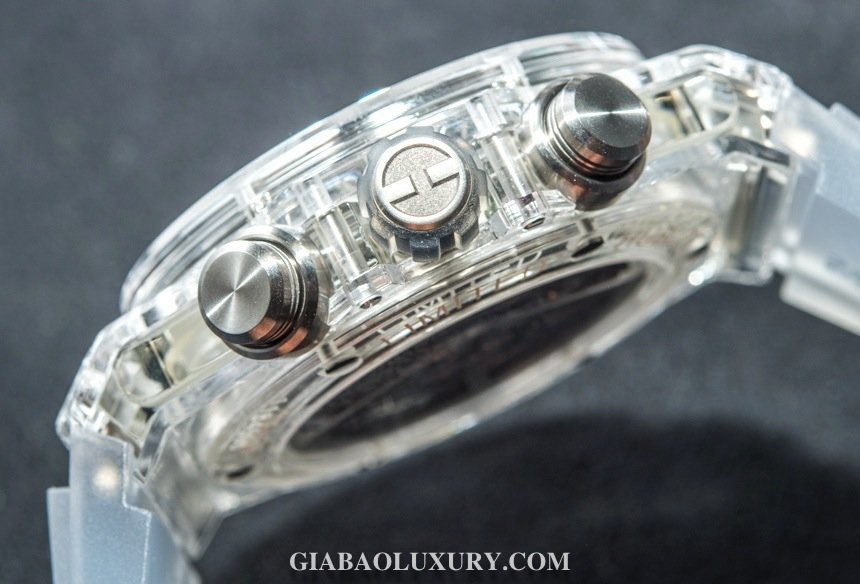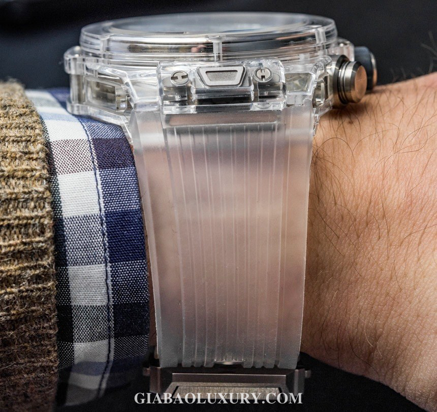 Chiếc đồng hồ vỏ sapphire chắc chắn là một trải nghiệm thú vị vì ngoại hình “sexy” xuyên thấu hết mức của nó. Tất cả những chi tiết lắp ghép trước đây được chế tác bằng những chất liệu khác nhau như thân vỏ, sườn bằng cao su, vành bezel, kim giờ phút giây và một số chi tiết trên mặt số…. đều được thay thế và chuyển hoá thành sapphire. Đường kính chiếc đồng hồ này là 45mm và chống nước 100 mét, ốc vít bằng titan. Lớp vỏ này không phải do Hublot sản xuất inhouse mà nhờ sự giúp đỡ của đơn vị thứ 3 chuyên chế tác sapphire tại Thuỵ Sĩ (có thể đó là Stettler Sapphire, công ty gia đình có truyền thống chế tác sapphire chất lượng tốt nhất thế giới).
