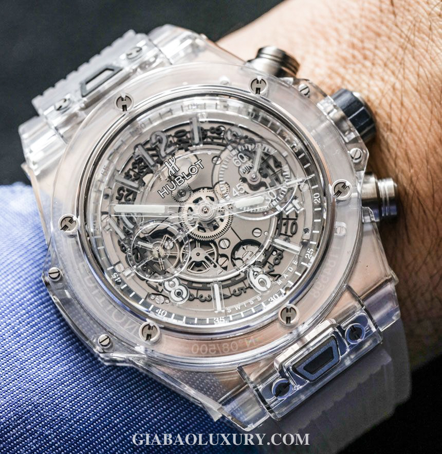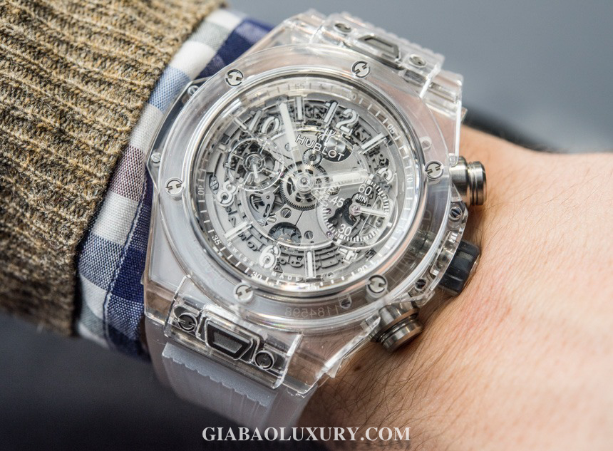 Trong những chất liệu ấy, khó sản xuất, hoàn thiện cũng như có giá thành được đẩy lên cao nhất có lẽ là những phiên bản vỏ đồng hồ bằng sapphire nguyên khối. Ngày hôm nay, Gia Bảo Luxury sẽ giới thiệu tới các bạn một chiếc đồng hồ có lớp vỏ như vậy, đến từ thương hiệu Hublot và có mức giá mà chúng tôi nghĩ là hợp lí, dưới 60.000 USD (so sánh với những chiếc đồng hồ thương hiệu khác có sở hữu lớp vỏ sapphire như Richard Mille RM056).