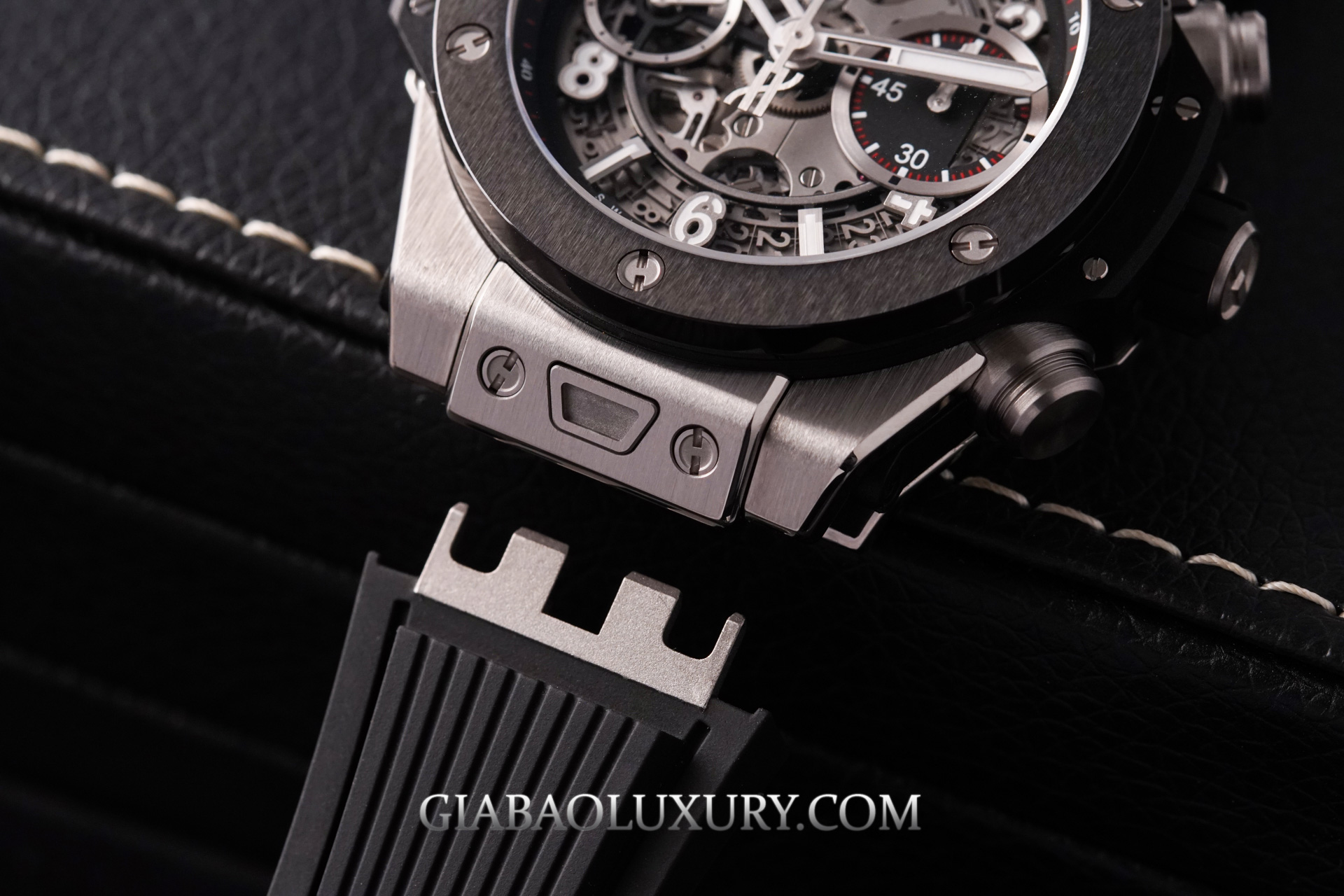Bộ dây cao su từ lâu vốn đã là đặc trưng của Hublot, và thật sự thì ít có thương hiệu có thể tự tin rằng họ có thể sản xuất dây cao su chất lượng hơn Hublot. Bộ dây này được cố định bởi khóa cài khắc tên thương hiệu Hublot. Giống với bộ vỏ, khóa dây cũng được kết hợp hai chất liệu Titanium và Ceramic với hai tông màu đen/xám hiện đại.