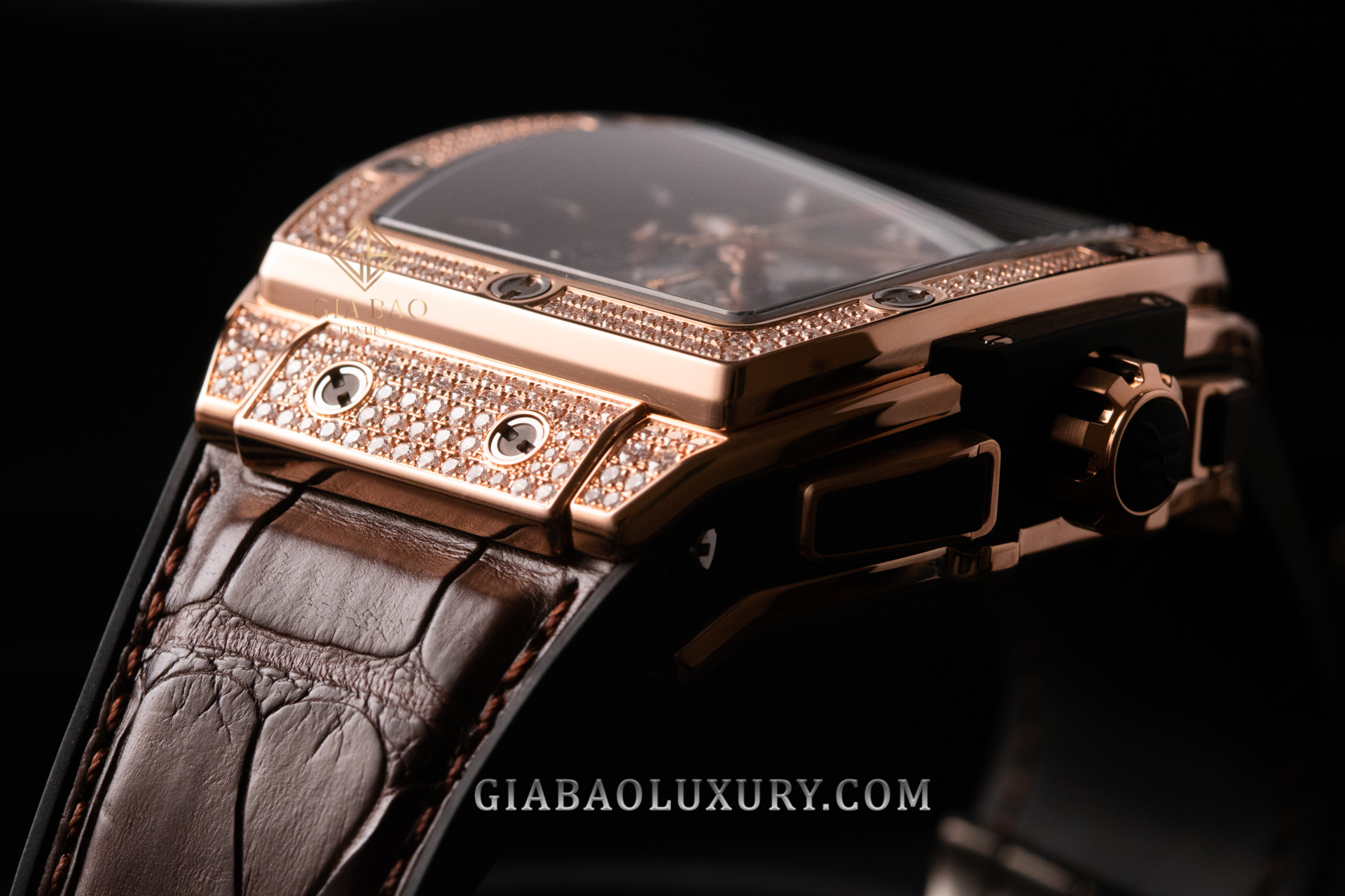 Với những phiên bản Spirit of Big Bang thông thường, vành bezel và càng nối dây sẽ trơn tru, để từ đó giới mộ điệu nhìn ngắm bề mặt chải xước trên chiếc đồng hồ cùng 10 đinh ốc tròn hình chữ H xuất hiện tại mặt trên của bộ vỏ. Tuy nhiên, với thiết kế hiện tại, nhà sản xuất đã bố trí số lượng lớn kim cương trên đó, phục vụ những khách hàng yêu thích vẻ đẹp lấp lánh của thứ vật chất cứng nhất hành tinh này. Có 156 viên kim cương (~0,89 cara) có mặt trên vỏ giữa đồng hồ và càng nối dây và 164 viên kim cương (0.9 cara) được sắp đặt trên vành bezel đồng hồ. Là một chiếc đồng hồ chronograph, hai nút bấm hình chữ nhật cỡ lớn đã được đệm bởi chất liệu bí mật màu đen để tránh vấn đề trơn trượt khi sử dụng.