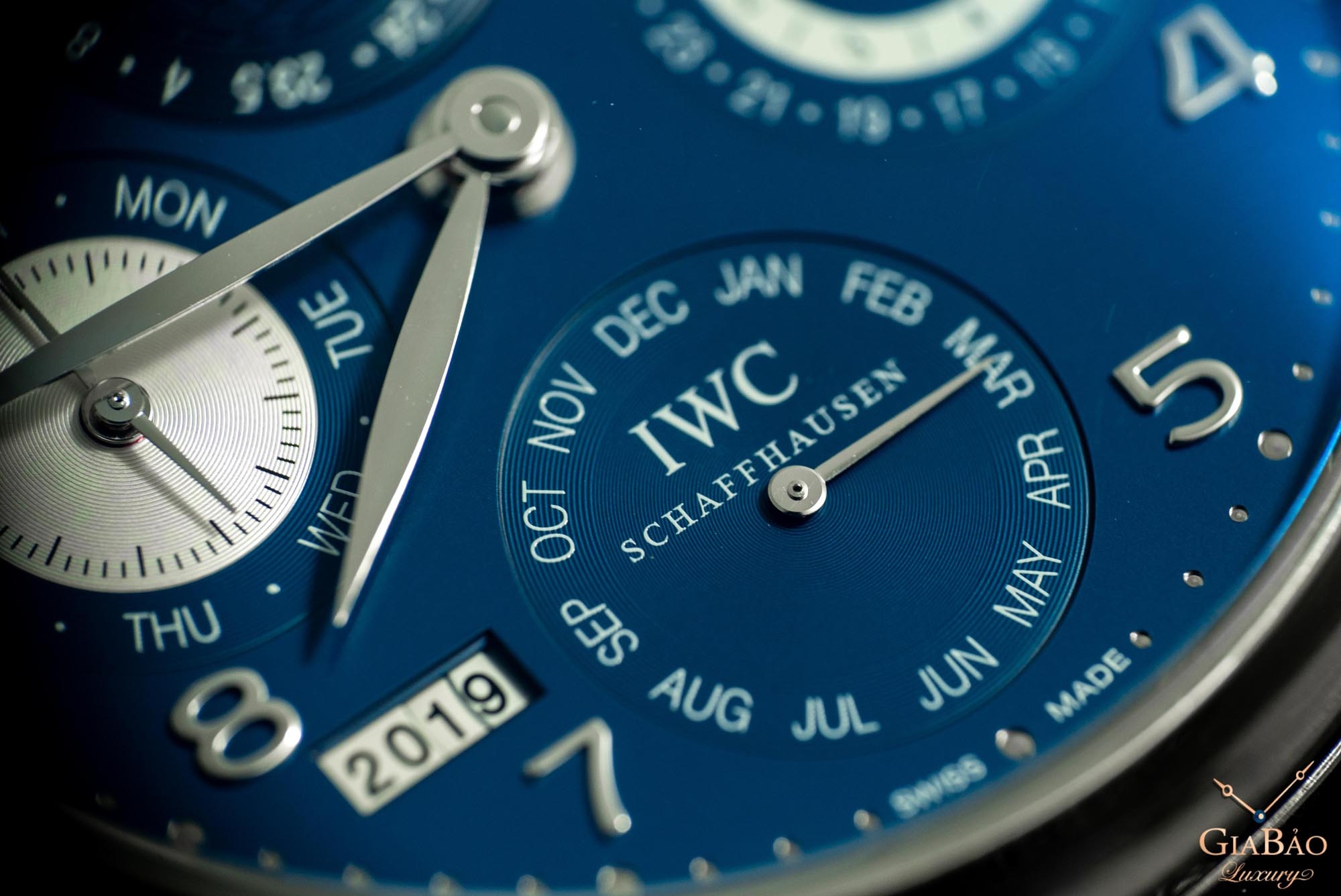 Là một chiếc đồng hồ Lịch vạn niên, như một nét dĩ nhiên IWC Portuguese sở hữu một mặt số có khá nhiều chi tiết. Trên mặt số xanh của IWC Portuguese là 4 mặt số phụ thể hiện các tính năng khác nhau. Các mặt số phụ góc 3, 6, 9 giờ với các kim ngắn dài khác nhau được nhà sản xuất chỉ định hiển thị các chức năng như là báo ngày và bộ dự trự năng lượng, báo tháng và báo thứ trong tuần. Hai mặt số phụ góc 3 và 9 giờ là bộ hiển thị kép hai chức năng được phân chia với hau màu xanh và trắng đối lập với nhau. Dễ nhận ra tại góc 9 giờ, mặt số phụ đếm giây xuất hiện trong tông màu trắng nổi bật với những đường tròn đồng tâm khiến chi tiết này thực sự nổi bật.