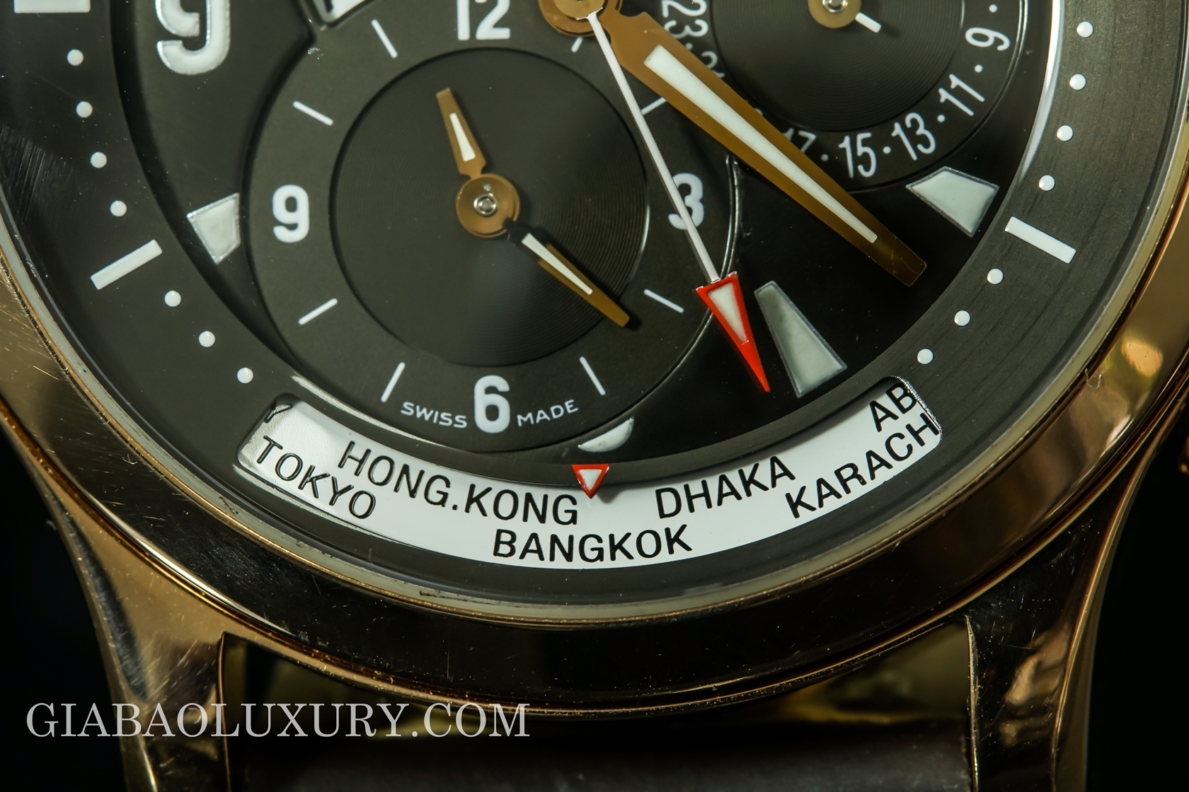 Chức năng cuối cùng mà cỗ máy kỳ diệu của Jaeger-LeCoultre Master Compressor Geographic cung cấp là WorldTime, cho phép người sử dụng biết được 24 múi giờ ở khắp nơi trên thế giới. Tại góc lệch phía 6h và 7h của mặt số là một ô cung cấp tên của các thành phố nổi tiếng và hoa lệ bậc nhất - Hong Kong, Tokyo, Bangkok... Tiếp theo đó là mặt số phụ liền kề chỉ 24h và lịch ngày đêm dưới dạng AM/PM, giúp người dùng biết được thời gian ở tất cả các thành phố xuất hiện trên mặt đồng hồ theo múi giờ. Nút điều chỉnh ở phía bên tay phải của vành Bezel cho phép chủ nhân chiếc đồng hồ có thể điều chỉnh giờ thế giới theo ý muốn. Chỉ với vài thao tác đơn giản này, chức năng WorldTime của Master Compressor sẽ đồng hành cùng bạn đi khắp thế giới.