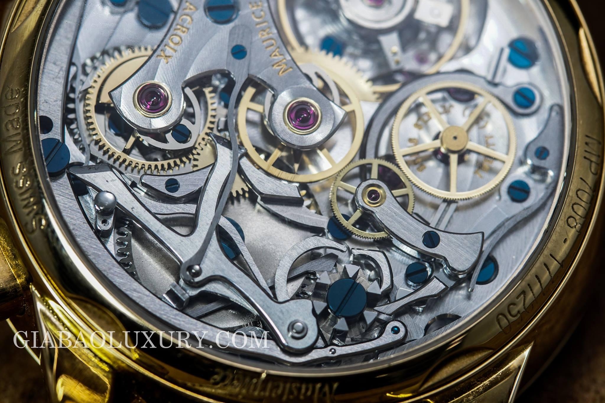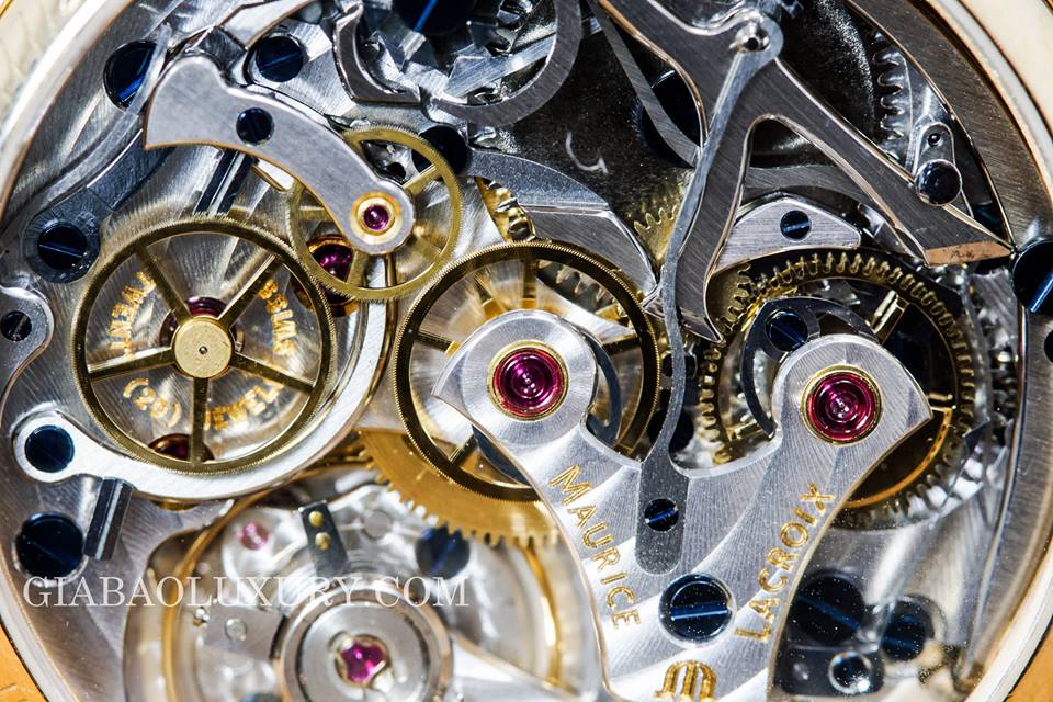 Nhưng đó mới là về ngoại hình và chức năng của Maurice Lacroix Masterpiece Le Chronographe. Một điều mà những kẻ đam mê đồng hồ có lẽ đều biết, đây là chiếc đồng hồ sở hữu cỗ máy cầu kỳ và phức tạp vào hàng bậc nhất. Maurice Lacroix sở hữu cỗ máy lên dây tuyệt vời ML 106-2 với lượng ốc vít kết nối cỗ máy được tinh luyện trong màu Tantalum và mặt sau máy để lộ bộ máy được sản xuất in house. Cỗ máy gồm 20 chân kính, biên độ dao động là 18.000 B/h và mức dự trữ năng lượng lên đến 48 giờ.