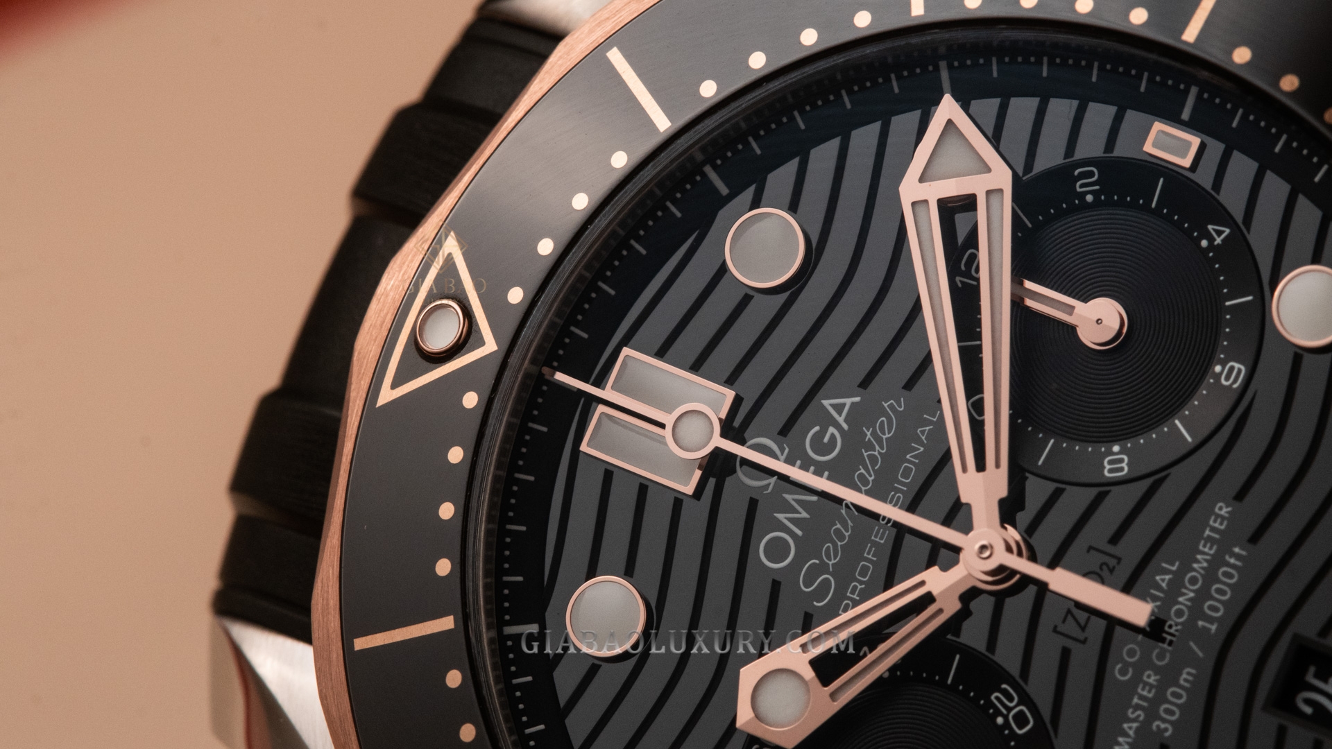 Chi tiết về chiếc đồng hồ Omega Seamaster Diver 300M Chronograph 210.22.44.51.01.001 vàng Sedna™- thép đi kèm dây đeo cao su