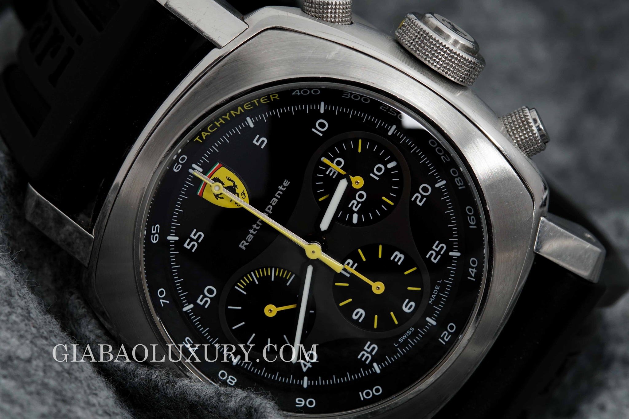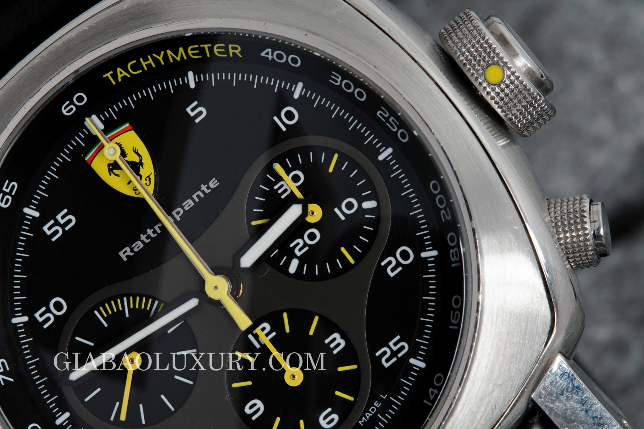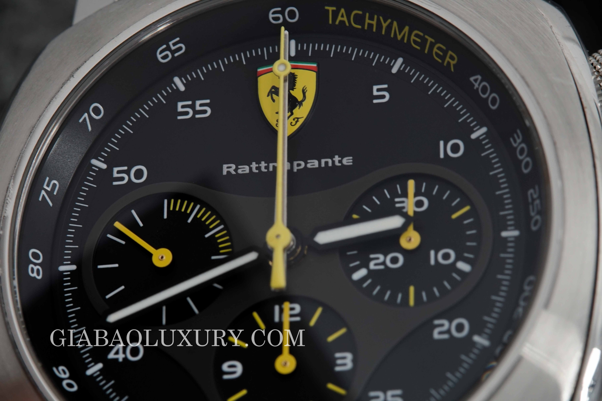 Mặt số của Panerai Ferrari Scuderia Rattrapante Chronograph được hoàn thiện với màu đen, vàng chủ đạo. Mặt số tròn 45mm được bao bọc bởi một vòng bezel hình vuông được mài cạnh cong, tạo nên một hình dáng mới lạ đậm chất Scuderia. Là một chiếc đồng hồ thể thao có hơi hướng của những siêu xe đẳng cấp Ferrari, trên mặt số của Panerai Ferrari Scuderia Rattrapante Chronograph không sử dụng số chỉ giờ mà thay vào đó là một vòng hiển thị chức năng Tachymeter - chức năng hỗ trợ đo tốc độ dựa trên thời gian trôi qua trên một quãng đường cố định. Chức năng Tachymeter của Panerai Ferrari Scuderia Rattrapante Chronograph đặc biệt sử dụng cho những chiếc xe đua hạng nặng, với mốc vận tốc từ 60 km/h đến 400km/h. Đặt đối xứng tại trung tâm của mặt số là 3 mặt số phụ chronograph tính giây, phút và giờ.