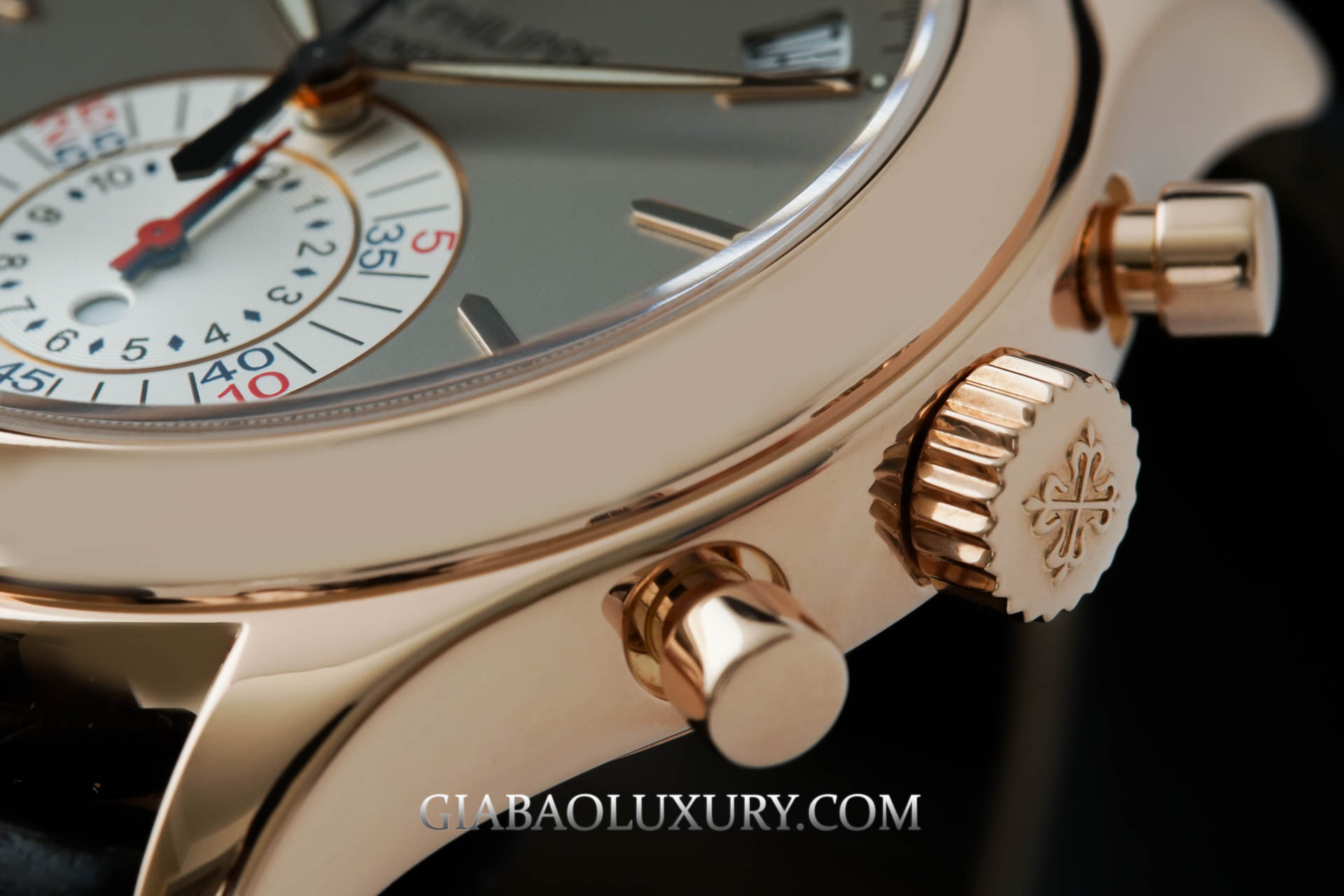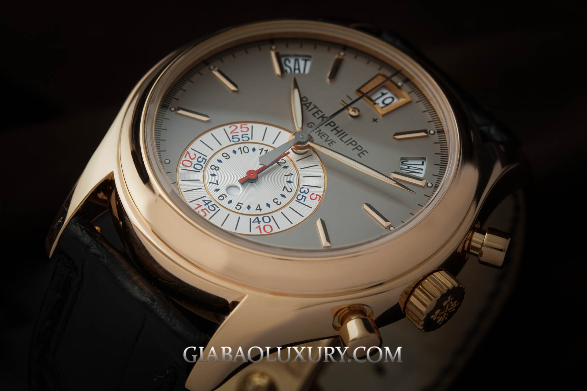 Nửa trên mặt số là Lịch, còn nửa dưới thì là vị trí dành cho tính năng bấm giờ Chronograph. Khác với những mẫu Chronograph thông thường, Patek Philippe kết hợp kim phút và kim giờ vào cùng một mặt số góc 6 giờ (thay vì 2 mặt số riêng). Thiết kế này khá độc đáo và đẹp mắt, duy chỉ có một vấn đề duy nhất: Không có chuyển động trên mặt số nếu không bấm Chronograph.