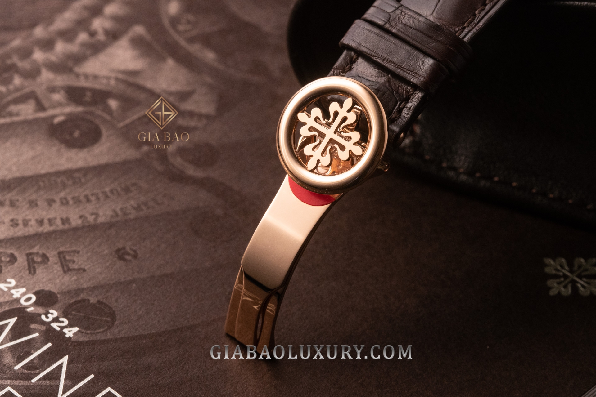 Đi kèm với chiếc đồng hồ là bộ da cá sấu màu nâu được khâu thủ công và bộ khóa gập hoa thị kinh điển của Patek Philippe. Quả thật, tôi phải ngạc nhiên về cách Patek Philippe chế tác bộ khóa dây của mình. Chiếc khóa gập vàng khối này vừa có sự chắc chắn cần thiết, không gặp trường hợp bị bật ra vô ý, nhưng cũng vừa dễ tháo ra mà không gặp chút khó khăn nào.