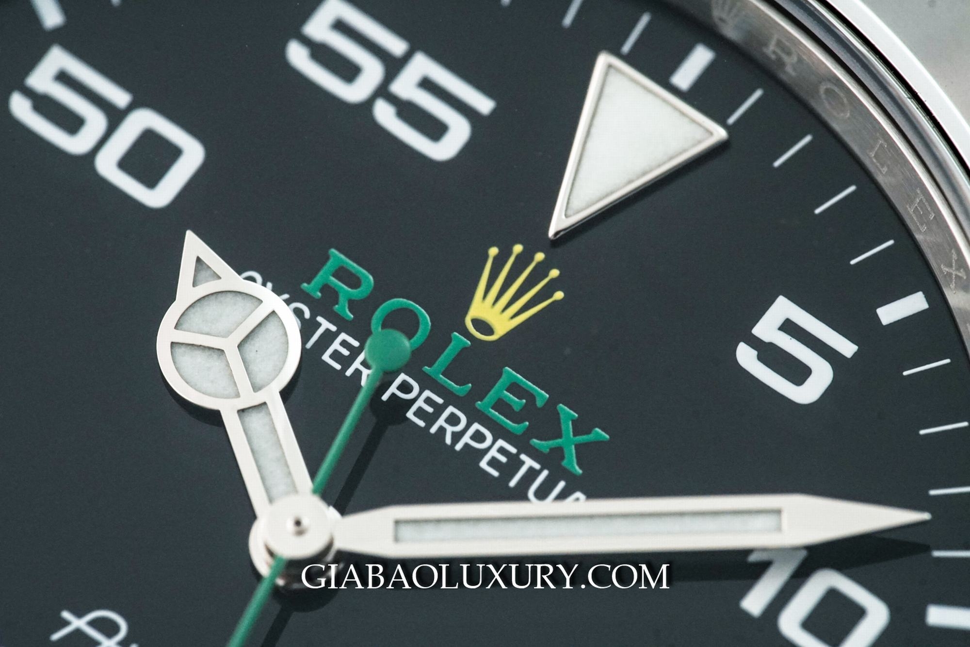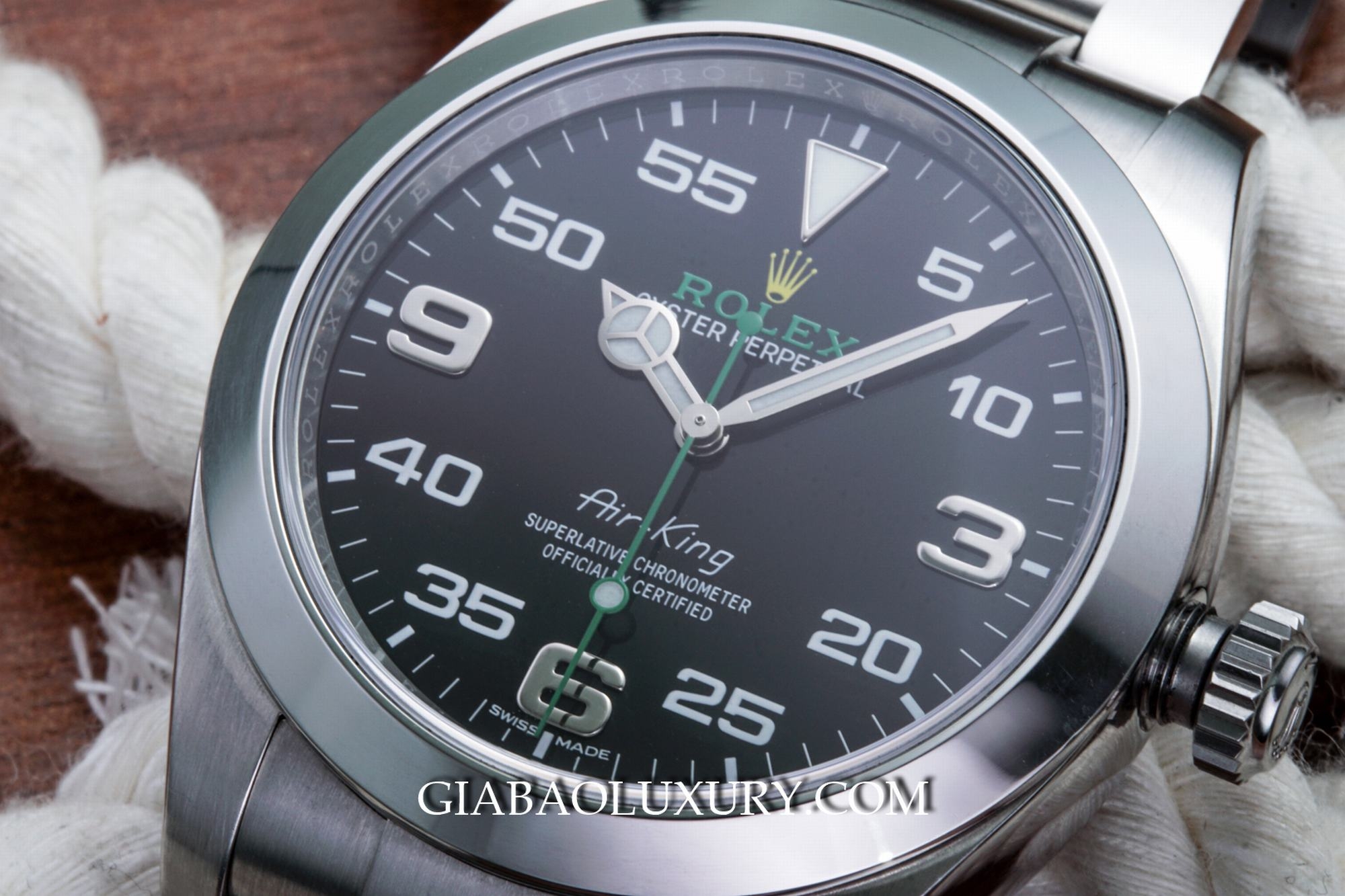 Mặt số màu đen đã làm mờ của chiếc Rolex Air-King 116900 nay hoàn thiện hơn nhờ vương miện màu vàng bên dưới tam giác bằng vàng trắng, đảm nhiệm cọc số 12 giờ. Bên dưới là sự sắp đặt có logic với tên thương hiệu Rolex màu xanh lá, cùng dòng chữ “Oyster Perpetual” màu trắng ngay sát dưới. Đối diện, ở góc 6 giờ, là tên bộ sưu tập Air-King bằng kiểu chữ cách điệu, đem đến sự thanh thoát, đơn giản, gợi nhớ đến logo Air-King của một thời quá khứ.
