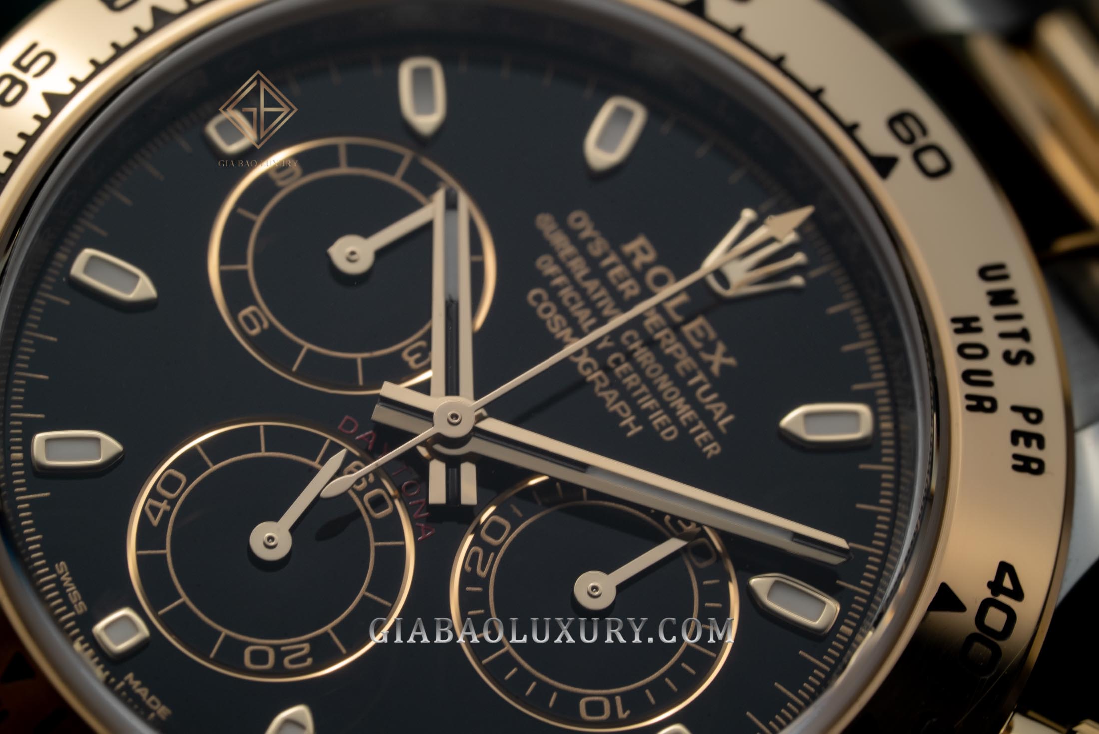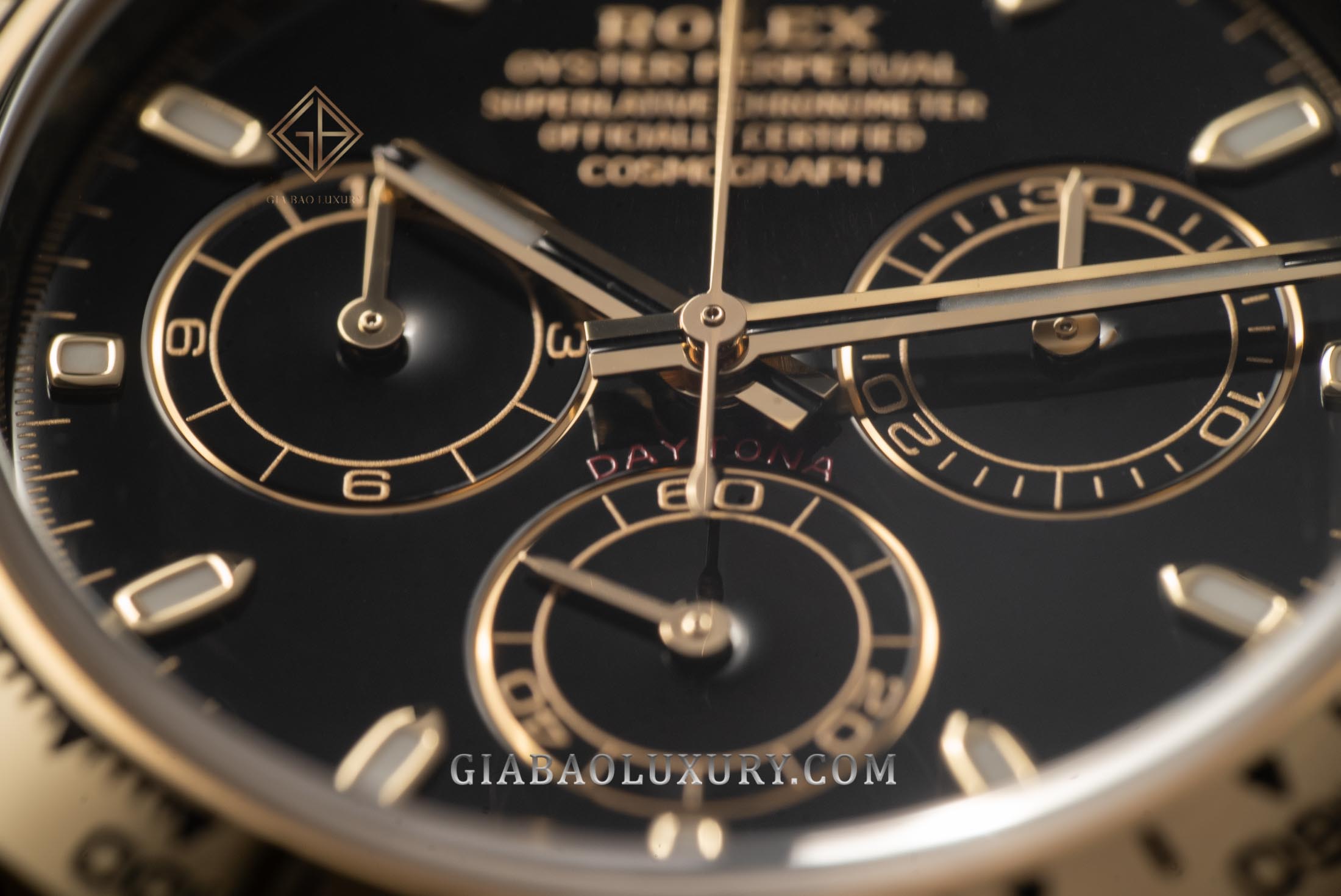 Về phần mặt số đồng hồ, trên lớp nền màu đen vẫn là sự có mặt của ba mặt số phụ trên thiết kế Rolex Cosmograph Daytona 116503. Ba mặt số phụ, 6 kim đồng hồ cùng cọc số chỉ giờ có phủ chất phát quang đã tạo nên một vẻ đẹp thể thao xen kẽ những yếu tố sang trọng khi chất liệu vàng được sử dụng trên mặt số đồng hồ. Hệ thống in trên mặt số, các kim hay vòng tròn tại ba bộ đếm thời gian đều có màu vàng, và được đánh sáng bóng.
