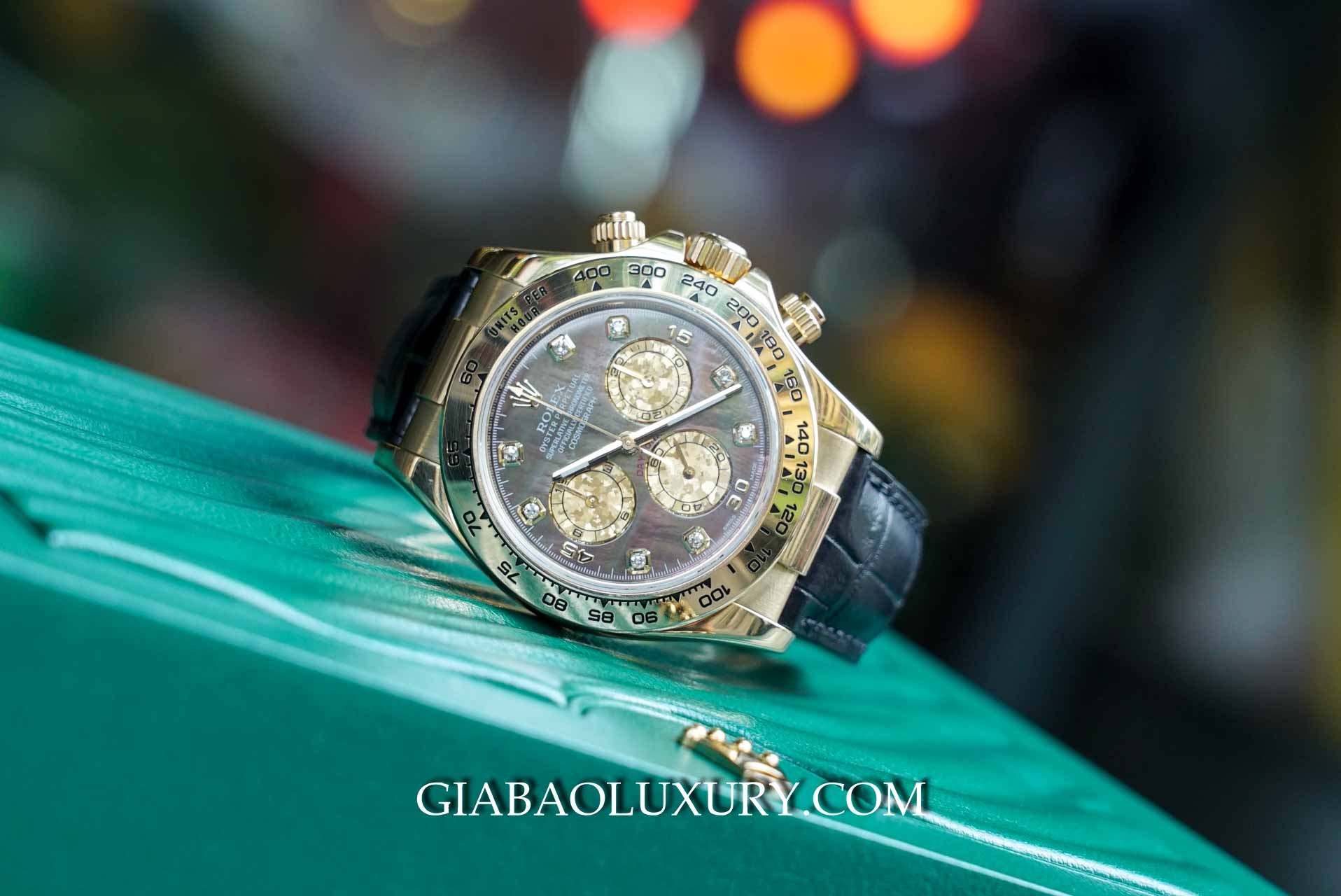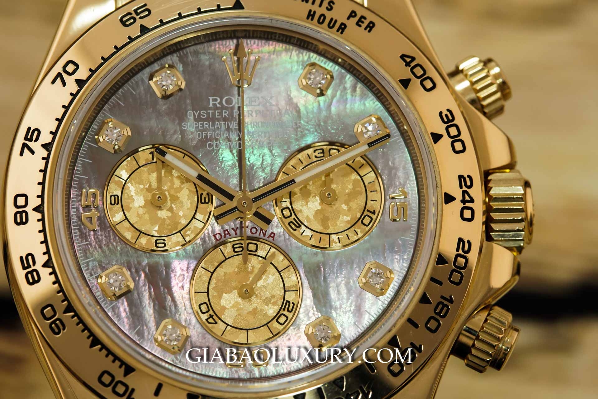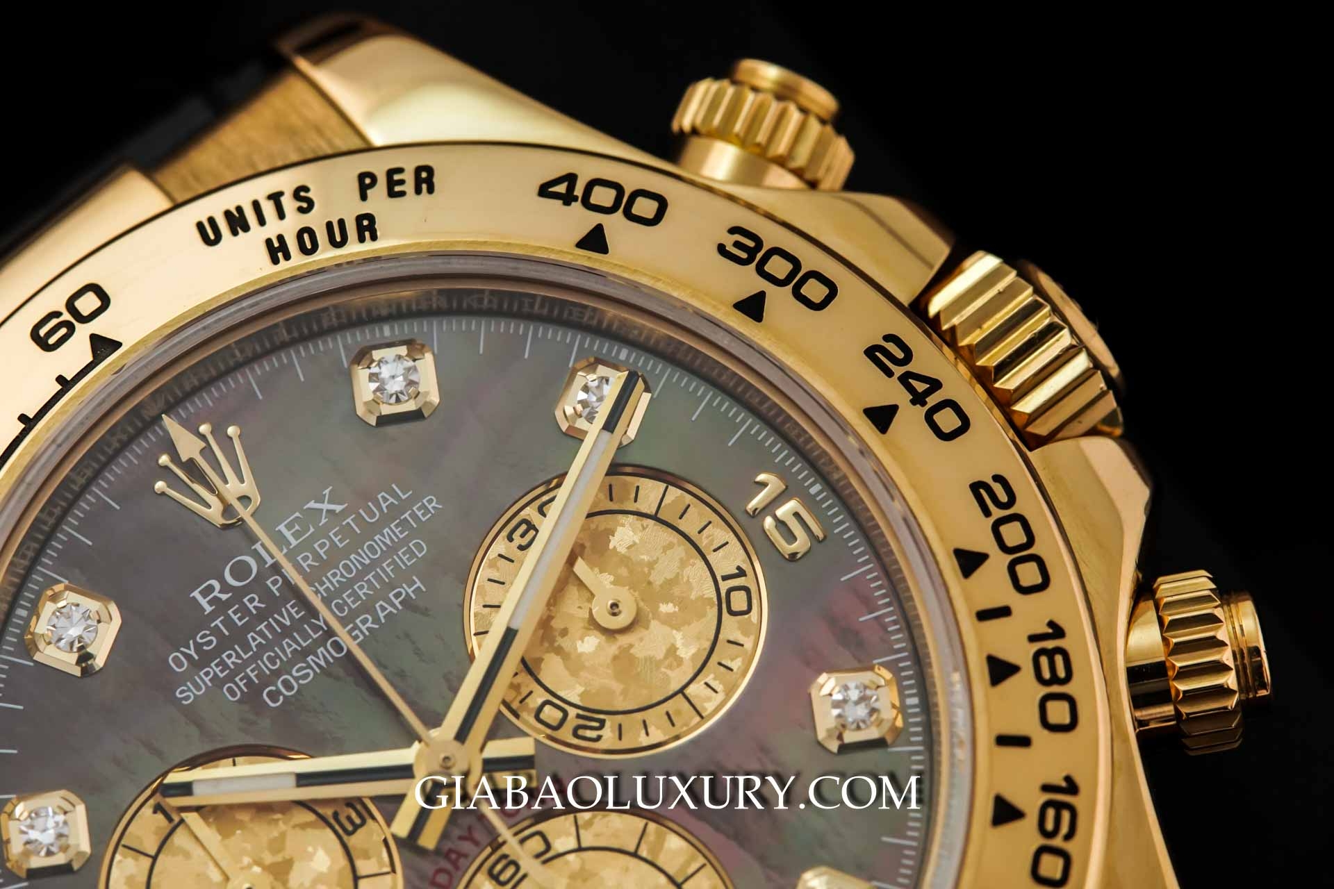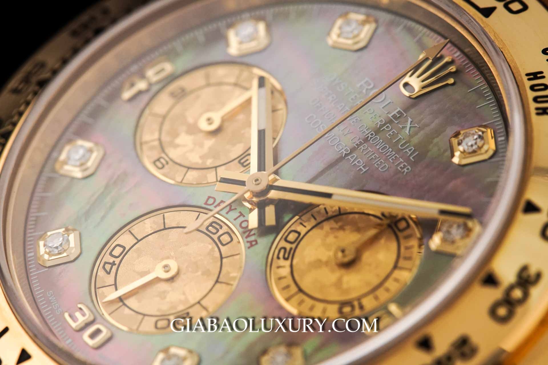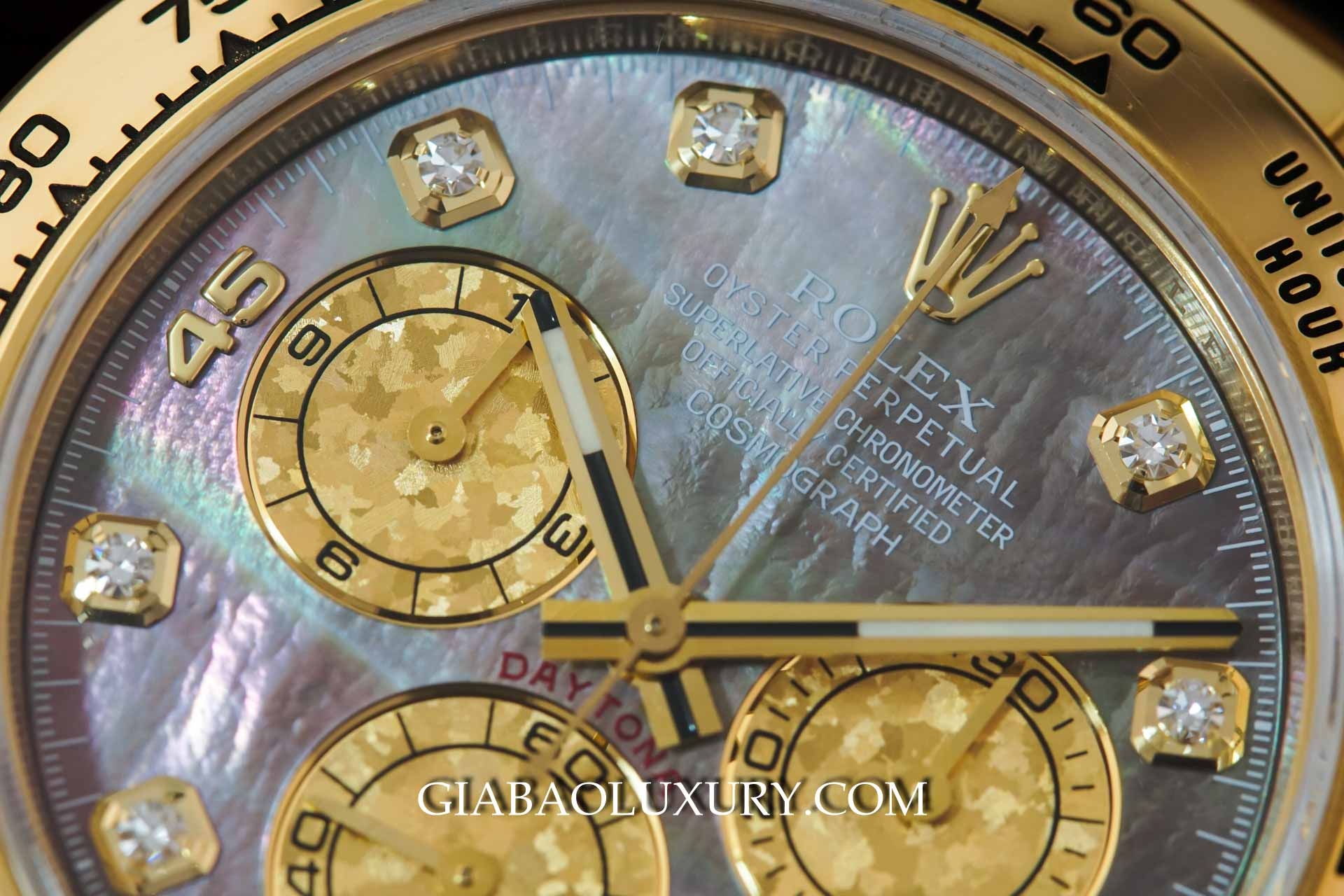 Được chế tác đề cao sự sang trọng, mặt số của mẫu Daytona 116518 còn được tô điểm bởi cọc số chỉ giờ bằng kim cương được bọc vàng hồng cẩn thận xen lẫn các vị trí 15, 30 và 45 phút được đính nổi bằng cũng bằng vàng hồng. Ngoài ra, bộ kim trung tâm còn được phủ chất phát quang thế hệ mới, củng cố nét thể thao cần có cho mẫu đồng hồ này.