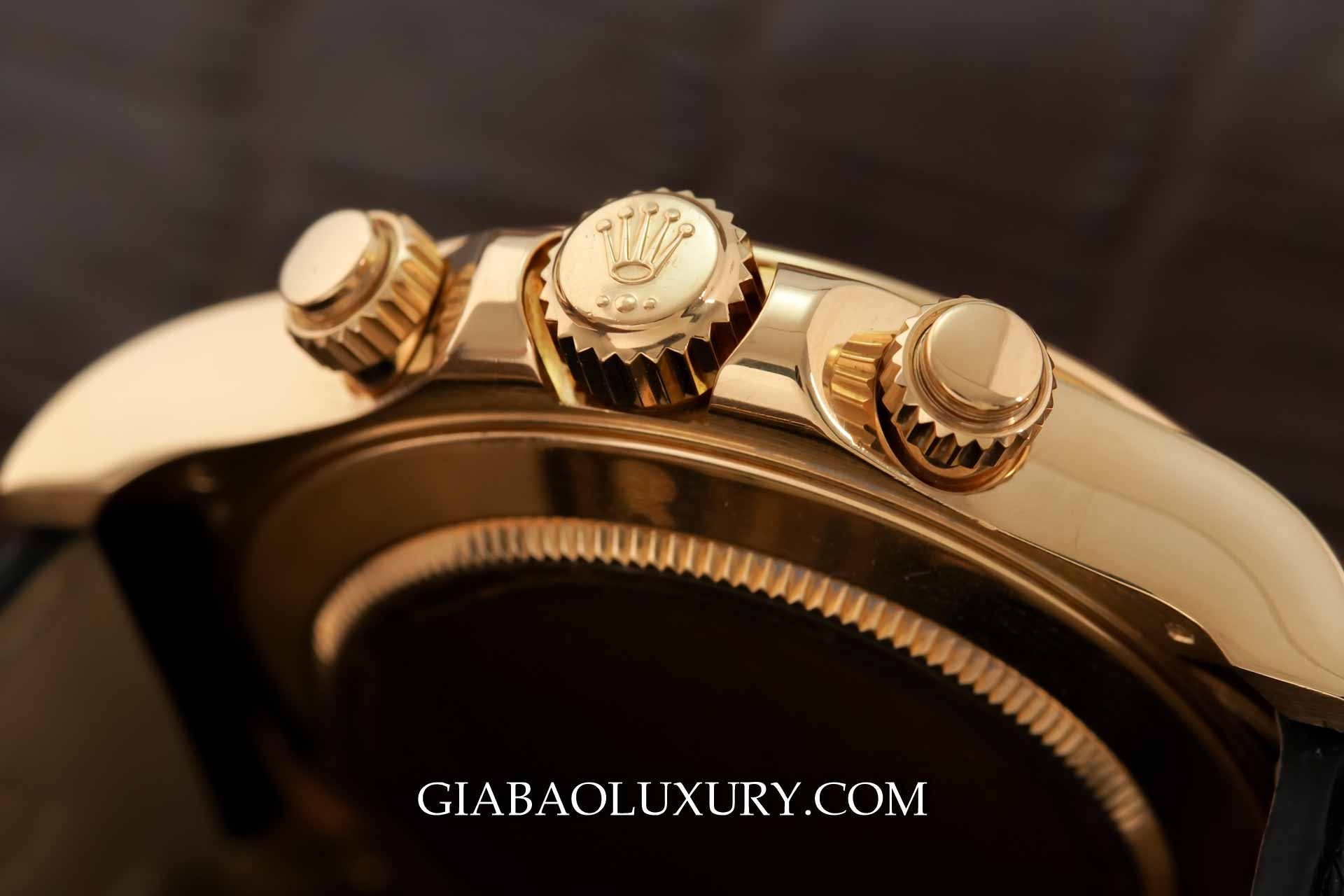 Xuất hiện là một cỗ máy thể thao đặc trưng, Rolex Cosmograph Daytona 116518 được bảo vệ trong bộ vỏ khung dáng Oyster bất đối xứng, bởi sự xuất hiện của hệ thống nút bấm chronograph kiểu dáng thể thao cùng núm điều chỉnh giờ đặc trưng nằm sườn ở sườn bên phải. Bộ vỏ khung bằng vàng với nắp lưng xoắn chặt cùng núm chỉnh giờ Triplock giúp chiếc Daytona tại Gia Bảo Luxury có thể chống nước ở độ sâu 100m, không thua kém bất kì người an hem nào khác trong đại gia đình Rolex.