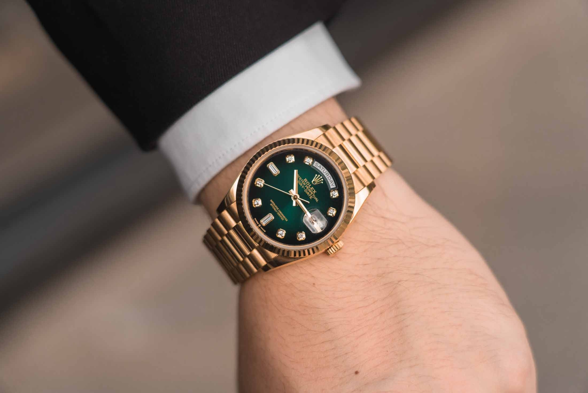 Mạnh mẽ, trang nhã và lịch lãm là những cụm từ được giới mộ điệu ưu ái dành riêng cho dòng đồng hồ Tổng thống. Sự mê hoặc của những phiên bản đồng hồ Day-Date chưa bao giờ thôi hấp dẫn với bất cứ ai đã và đang sở hữu hay biết về chúng, giống như một “mặt trăng” giữa muôn vàn vì tinh tú, chiếc đồng hồ mặt số xanh lục này đã góp phần khẳng định thêm tầm cỡ của bộ sưu tập. Được biết, cỗ máy này có mức giá bán lẻ là 31.350 USD.