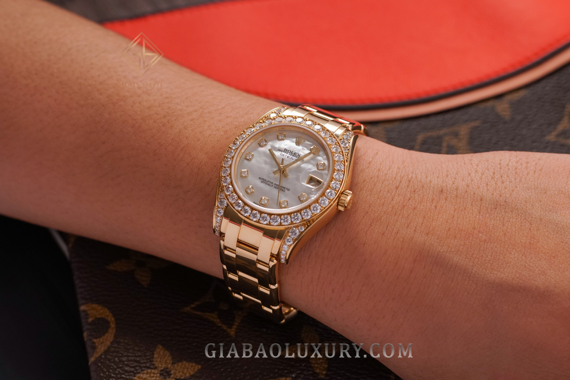 Bộ vỏ 34mm của phiên bản đồng hồ Pearlmaster 81158 đã được đánh bóng trơn tru toàn bộ từ cạnh bên cho nên từng mắt của dây đeo trừ phần đáy xoắn chặt đằng sau đồng hồ. Là một thiết kế dành cho nữ giới, bộ vỏ vàng vàng sáng bóng của phiên bản Rolex Pearlmaster 81158 trông đặc biệt nữ tính và có đường cong mềm mại.