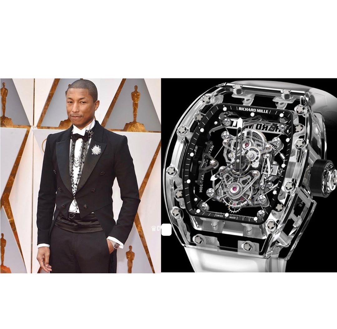Tại lễ trao giải Oscars năm 2017, Pharrell Williams đã tham dự và đeo trên tay một mẫu đồng hồ độc bản đến từ thương hiệu Richard Mille. Chiếc đồng hồ có mã hiệu RM 56-02 và được làm từ sapphire. Chất liệu khác thường này khiến chiếc đồng hồ có vẻ trong suốt và long lanh khó tả. Những chi tiết máy thuộc đồng hồ RM 56-02 dễ dàng lọt vào mắt người đối diện.