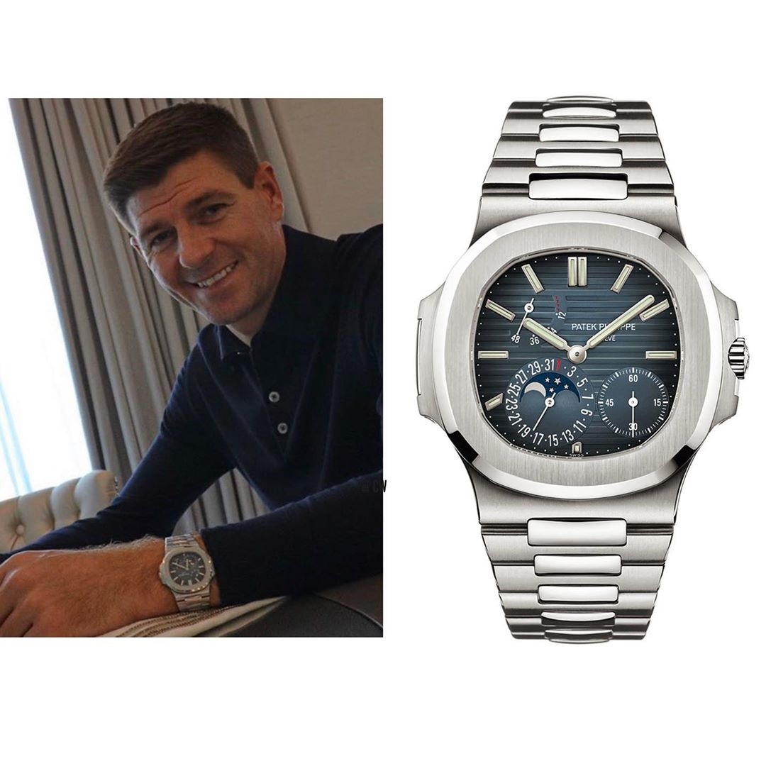 Trước khi trở thành huấn luyện viên trưởng câu lạc bộ Rangers (Scotland), Steven Gerrard là một huyền thoại của câu lạc bộ Liverpool. Chân đá này sở hữu chiếc đồng hồ Patek Philippe Nautilus ref. 5712/1A với các chức năng là moonphase và vòng tròn bao ngày ngay trên mặt số đồng hồ.