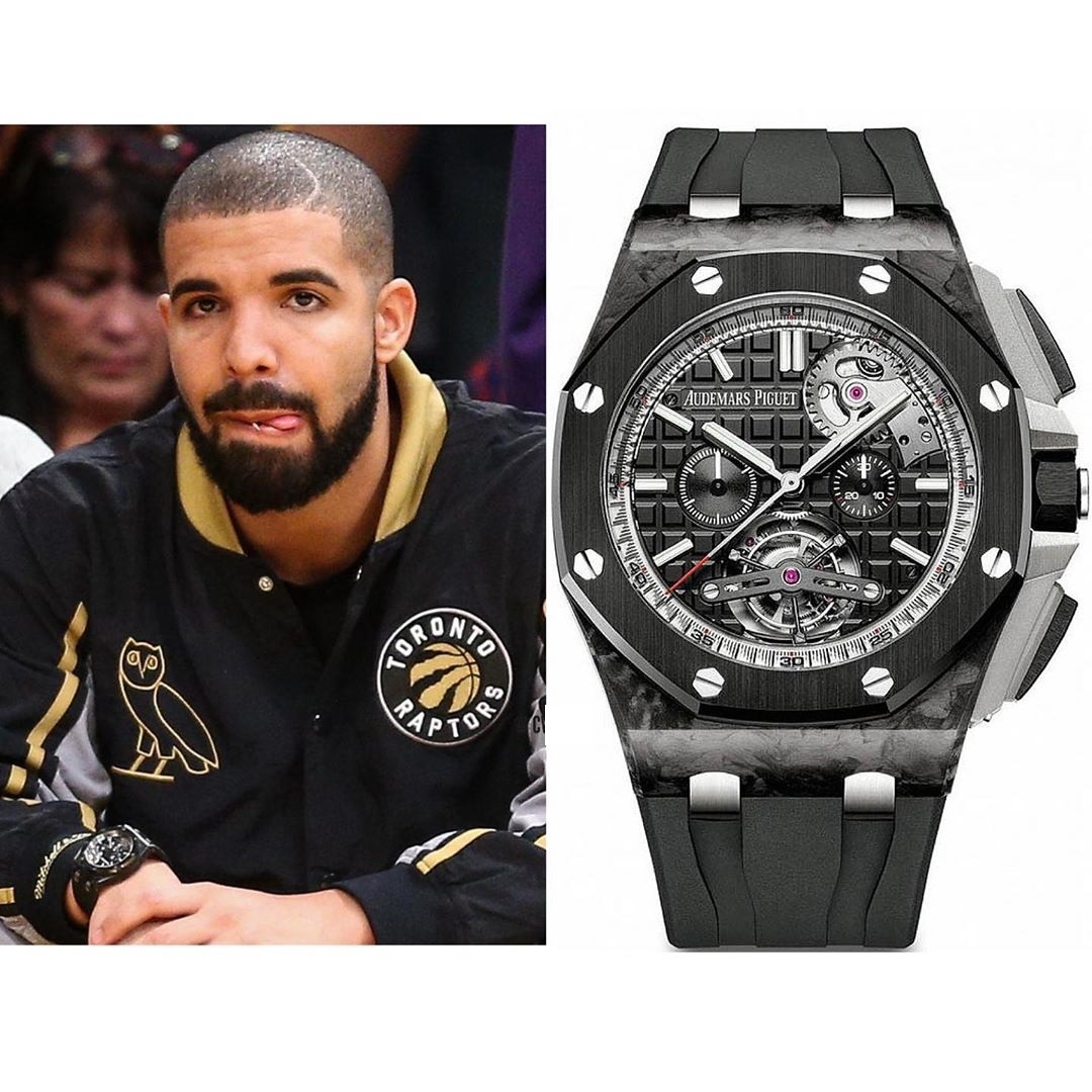 Anh chàng ca sĩ, nhà sản xuất âm nhạc Drake/Champagne Papi xuất hiện liên lục với những chiếc đồng hồ của nhiều thương hiệu, phong cách khác nhau. Trong số thứ nhất của series bài viết Sao thế giới đeo gì?, Gia Bảo Luxury đã đưa tới bức hình gần đây của anh khi bế trên tay cậu con trai mới nhận, thì với số hiện tại là về hình ảnh Drake 3 năm trước. Bức ảnh được ghi lại vào năm 2017 khi Drake đang theo dõi trận cho những rapper tại Toronto. Chiếc đồng hồ anh đang đeo là Royal Oak Offshore phiên bản giới hạn màu đen từ mặt số, dây đeo cho tới bộ vỏ.