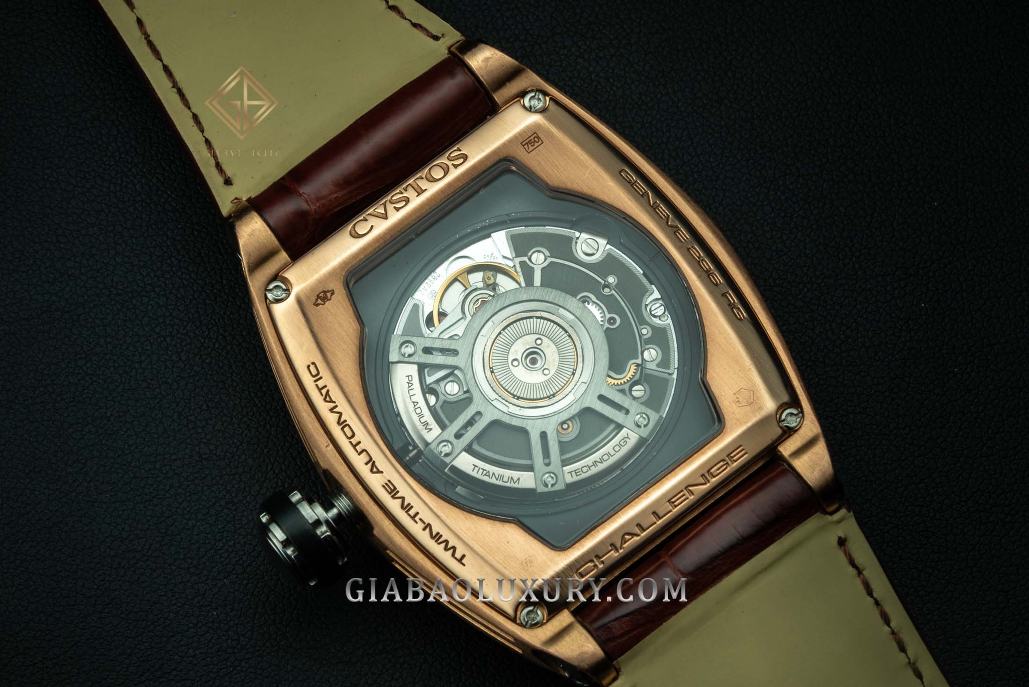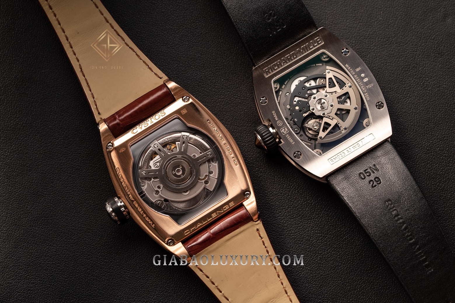 Điều này cũng thật dễ nhận ra khi xoay hai chiếc đồng hồ tâm điểm lại. Mặt kính sapphire trong suốt tại đáy của Richard Mille 023 và CVSTOS Challenge Twin-Time đã tiết lộ phần nào của bộ máy tự động đang cung cấp năng lượng cho cả chiếc đồng hồ. Và tuyệt nhiên, ở phần này, chúng ta buộc phải khẳng định thương hiệu đồng hồ Richard Mille top đầu đã chăm chút cho đứa con cưng RM 023 của mình tới mức nào, điều mà CVSTOS hiện vẫn chưa thể theo kịp, ít nhất là trong chiếc Challenge Twin-Time CTT RGR này đây.