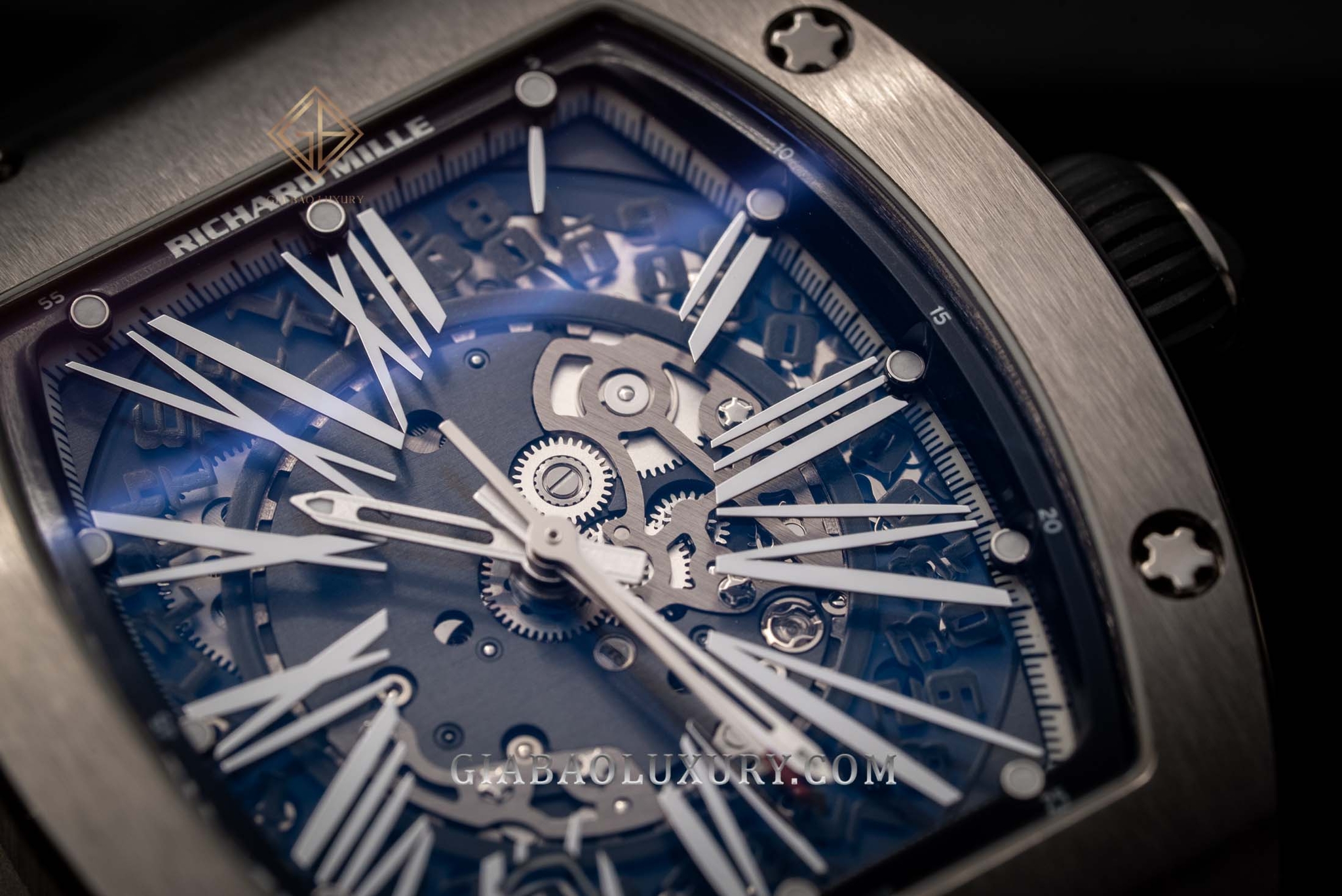 Bộ máy đồng hồ hiện phía sau chiếc Richard Mille RM 023 hiện lên chỉn chu với tông màu đen và ghi tối. Rotor chỉ xoay được một chiều phủ xám đồng nhất với những đinh ốc hình bánh xe đặc trưng nhà Richard Mille. Những mảnh cầu nối bên dưới được phủ PVD đen cẩn thận, truyền thống không khó nhận ra trên bất kỳ thiết kế nào khác do Richard Mille đã sản xuất.